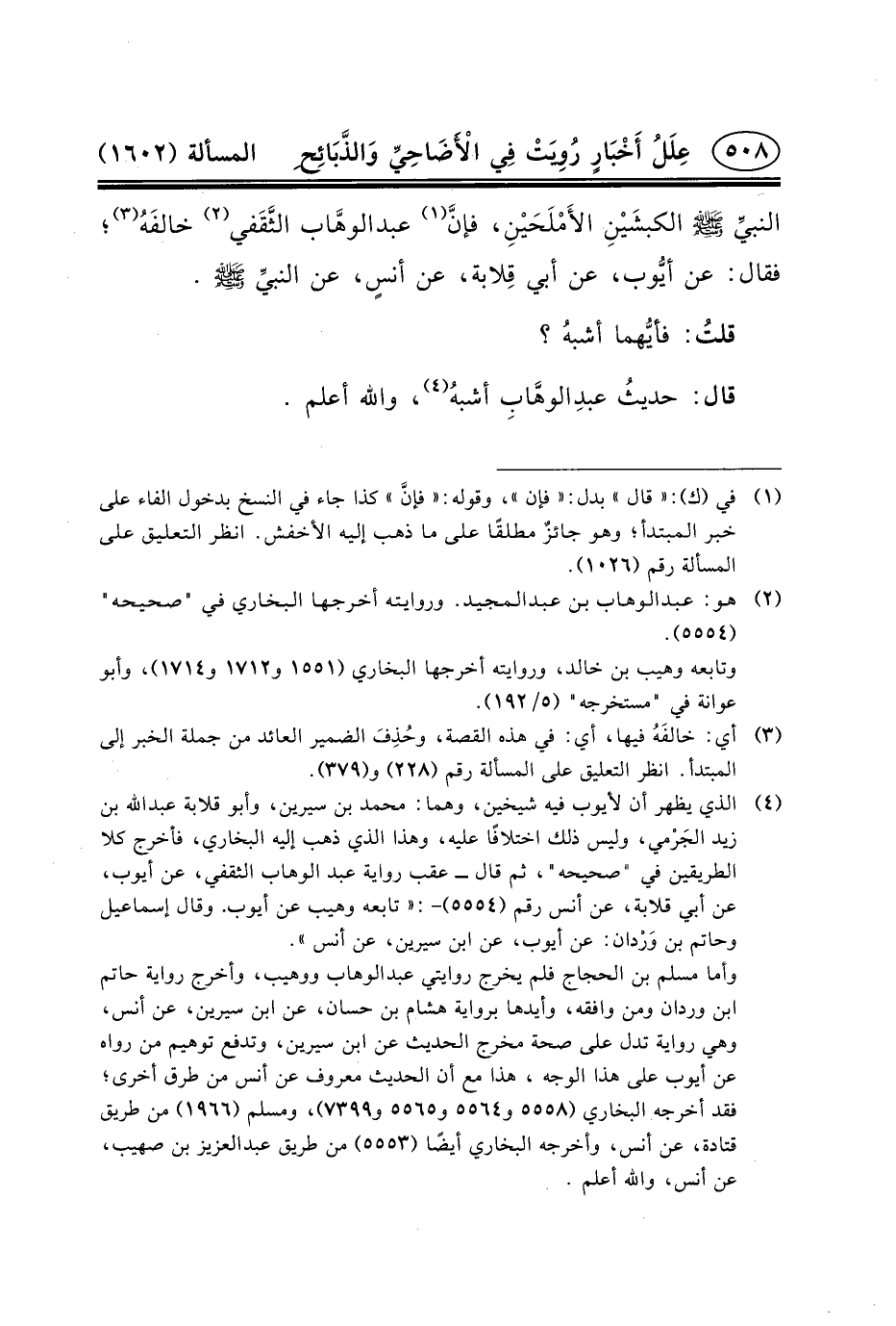 النبيِّ (ص) الكبشَيْنِ الأَمْلَحَيْنِ، فإنَّ (١) عبد الوهَّاب الثَّقَفي (٢) خالفَهُ (٣) ؛ فَقَالَ: عَنْ أيُّوب، عَنْ أَبِي قِلابة، عَنْ أنسٍ، عن النبيِّ (ص) .