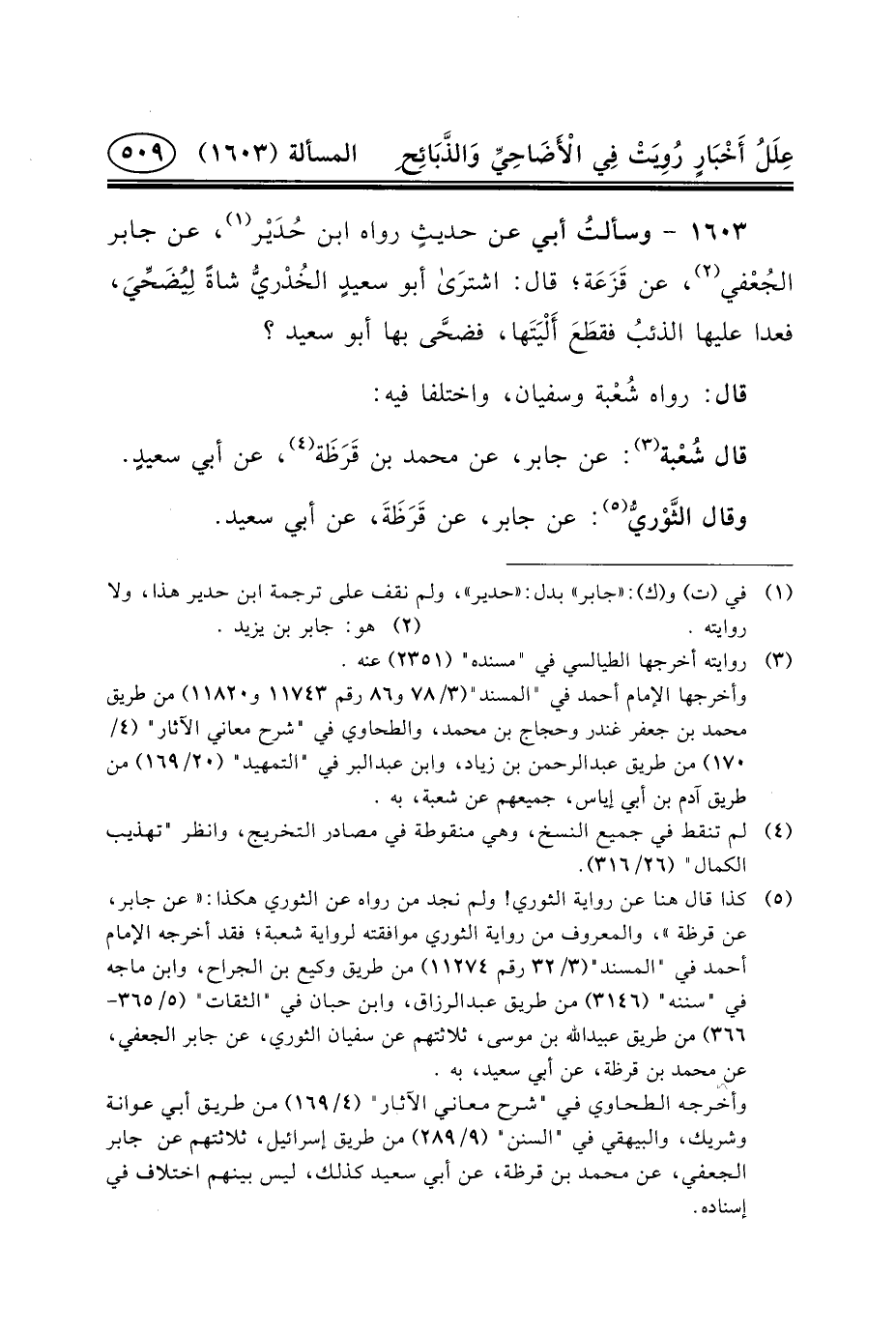 ١٦٠٣ - وسألتُ أَبِي عَنْ حديثٍ رَوَاهُ ابْنُ حُدَيْر (١) ، عَنْ جَابِرٍ الجُعْفي (٢) ، عَنْ قَزَعَة؛ قَالَ: اشترَى أَبُو سعيدٍ الخُدْريُّ شَاةً لِيُضَحِّيَ، فَعَدَا عَلَيْهَا الذئبُ فقطَعَ أَلْيَتَها، فضحَّى بِهَا أَبُو سَعِيدٍ؟