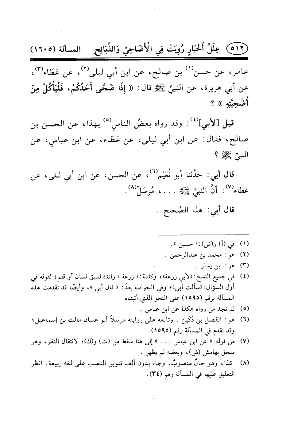 (٤) في جميع النسخ: «لأبي زرعة» ، وكلمة: «زرعة» زائدة لسبق لسان أو قلم؛ لقوله في أول السؤال: «سألت أبي» ؛ وفي الجواب بعدُ: «قال أبي» ، وأيضًا قد تقدمت هذه المسألة برقم (١٥٩٥) على النحو الذي أثبتناه.