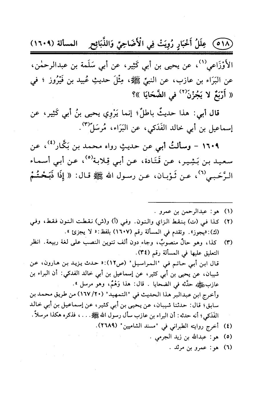 ١٦٠٩ - وسألتُ أَبِي عَنْ حديثٍ رَوَاهُ مُحَمَّدُ بْنُ بَكَّار (٤) ، عَنْ سَعِيدِ بْنِ بَشِير، عَنْ قَتَادة، عَنْ أَبِي قِلابة (٥) ، عَنْ أَبِي أَسْمَاءَ الرَّحَبي (٦) ، عَنْ ثَوْبان، عن رسول الله (ص) قال: إِذَا ذَبَحْتُمْ
