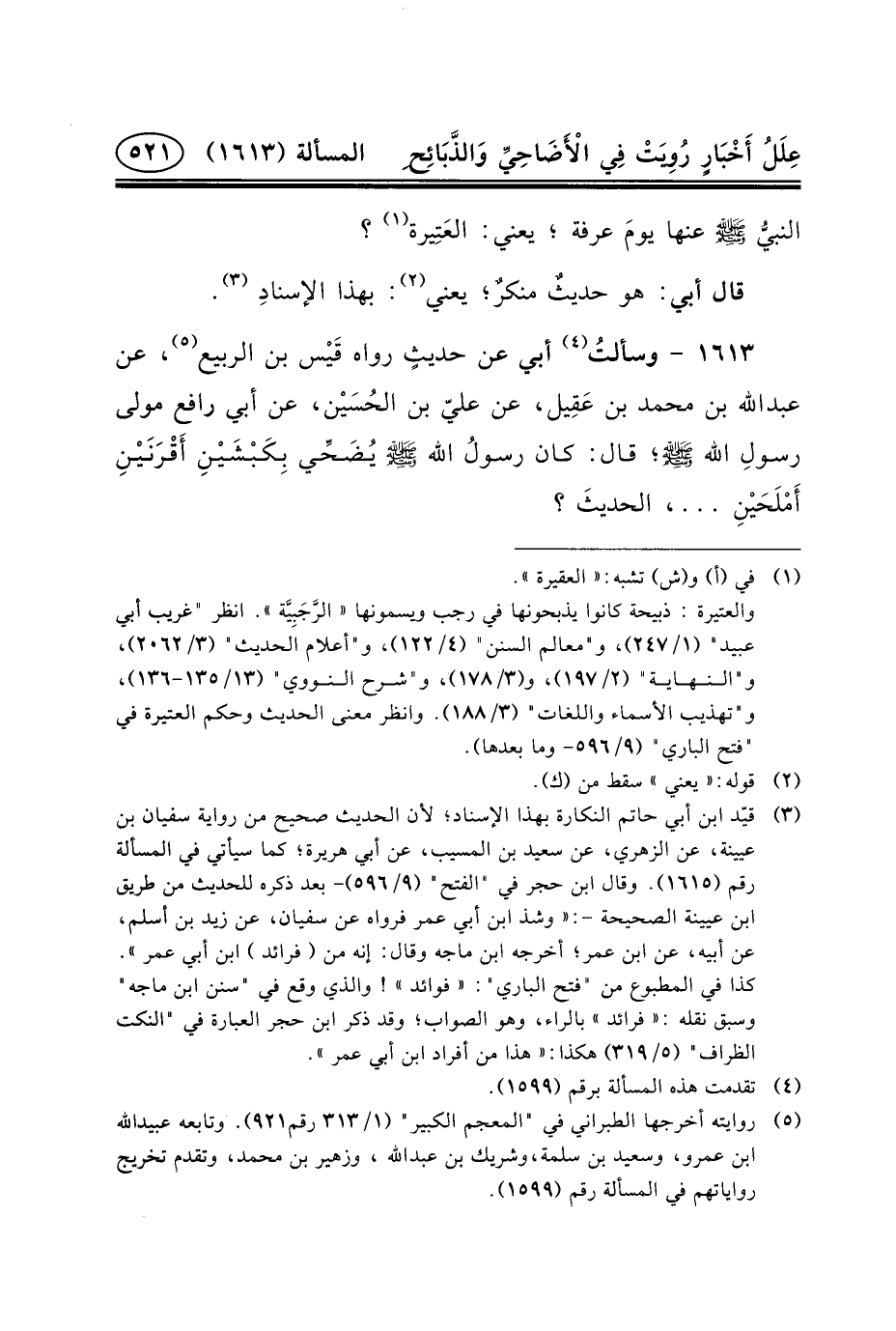 ١٦١٣ - وسألتُ (٤) أَبِي عَنْ حديثٍ رَوَاهُ قَيْس بْنُ الربيع (٥) ، عن عبد الله بْنِ مُحَمَّدِ بْنِ عَقِيل، عَنْ عَلِيِّ بْنِ الحُسَيْن، عَنْ أَبِي رافع مولى رسولِ الله (ص) ؛ قال: كان رسولُ الله (ص) يُضَحِّي بِكَبْشَيْنِ أَقْرَنَيْنِ أَمْلَحَيْنِ ... ، الحديثَ؟
