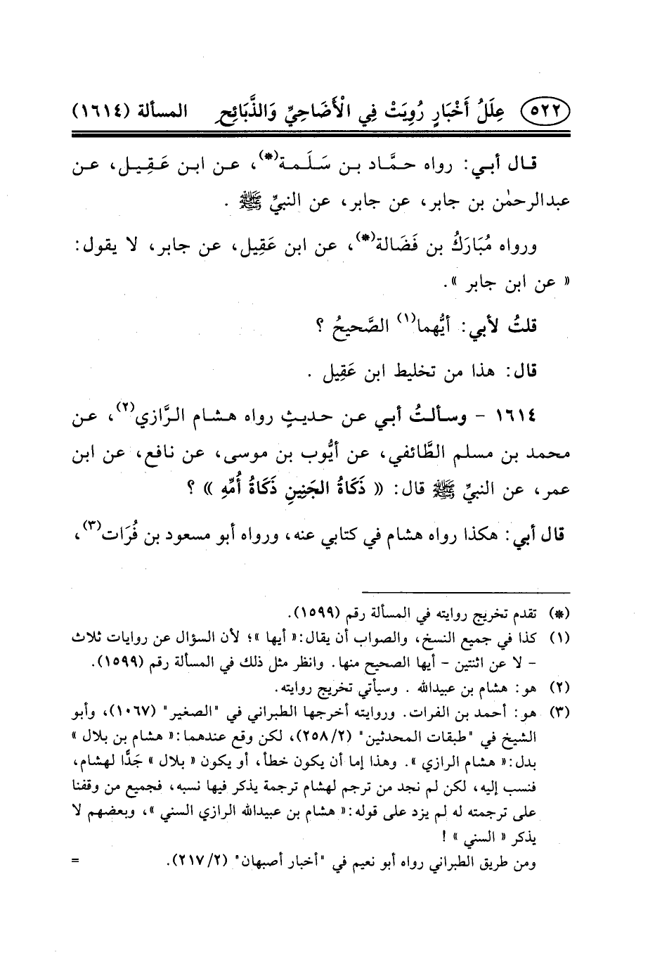 ١٦١٤ - وسألتُ أَبِي عَنْ حديثٍ رَوَاهُ هِشَامُ الرَّازي (٢) ، عَنْ مُحَمَّدِ بْنِ مُسْلِمٍ الطَّائفي، عَنْ أيُّوب بْنِ مُوسَى، عَنْ نَافِعٍ، عَنِ ابْنِ عُمَرَ، عن النبيِّ (ص) قَالَ: ذَكَاةُ الجَنِينِ ذَكَاةُ أُمِّهِ؟ قَالَ أَبِي: هَكَذَا رَوَاهُ هِشَامٌ فِي كِتَابِي عَنْهُ، وَرَوَاهُ أَبُو مسعود بن فُرَات (٣) ،
