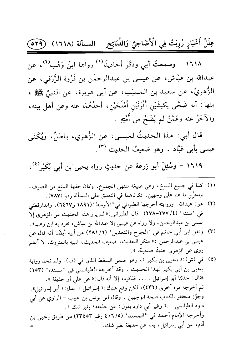 ١٦١٩ - وسُئِلَ أَبُو زُرْعَةَ عَنْ حديثٍ رَوَاهُ يَحْيَى بن أبي بُكَيْر (٤) ،