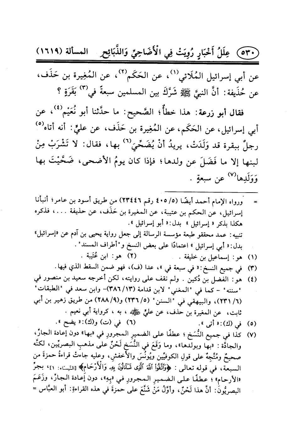 عَنْ أَبِي إِسْرَائِيلَ المُلَائي (١) ، عَنِ الحَكَم (٢) ، عَنِ المُغِيرة بْنِ حَذَف، عن حُذَيفة: أنَّ النبيَّ (ص) شَرَّكَ بين المسلمين سَبْعَةٍ فِي (٣) بَقَرَةٍ؟