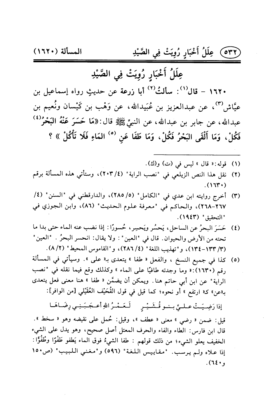 ١٦٢٠- قال (١) : سألتُ (٢) أَبَا زُرْعَةَ عْنَ حديثٍ رَوَاهُ إِسْمَاعِيلُ بْنُ عيَّاش (٣) ، عَنِ عبد العزيز بن عُبَيدالله، عَنْ وَهْب بْنِ كَيْسان ونُعيم بن عبد الله، عن جابر بن عبد الله، عن النبيِِّّ (ص) قَالَ: مَا حَسَرَ عَنْهُ البَحْرُ (٤) فَكُلْ، وَمَا أَلْقَى البَحْرُ فَكُلْ، وَمَا طَفَا عَنِ (٥) المَاءِ فَلَا تَأْكُلْ؟