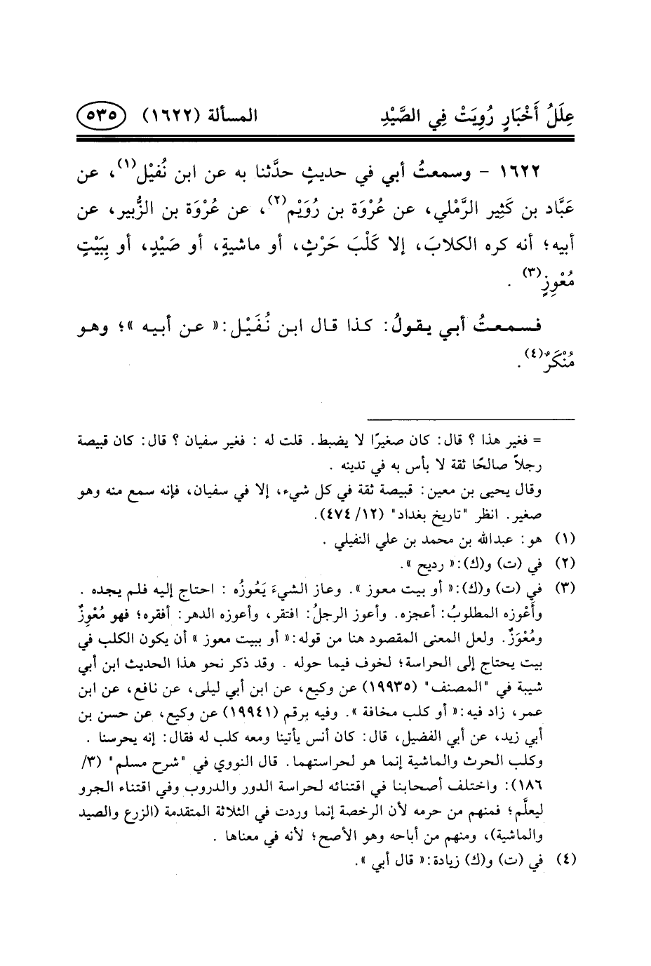 ١٦٢٢ - وسمعتُ أَبِي فِي حديثٍ حدَّثنا بِهِ عَنِ ابْنِ نُفيْل (١) ، عَنْ عَبَّاد بْنِ كَثِير الرَّمْلي، عَنْ عُرْوَة بْنِ رُوَيْم (٢) ، عَنْ عُرْوَة بْنِ الزُّبير، عَنْ أَبِيهِ؛ أَنَّهُ كَرِهَ الكلابَ، إِلا كَلْبَ حَرْثٍ، أَوْ ماشيةٍ، أَوْ صَيْدٍ، أَوْ بِبَيْتٍ مُعْوِزٍ (٣) .