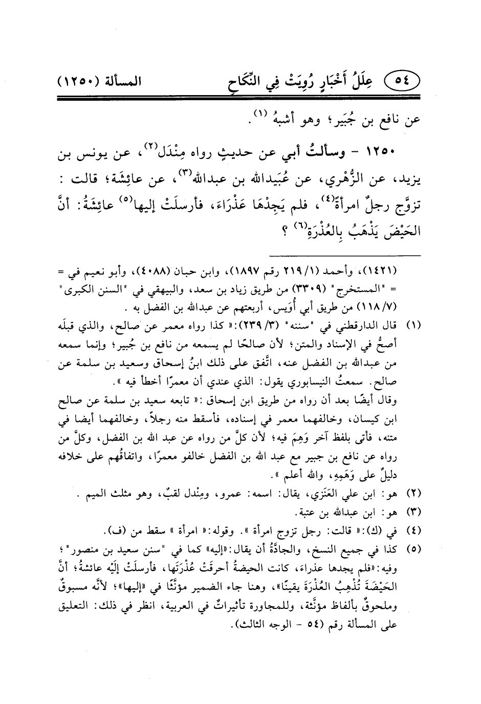 ١٢٥٠ - وسألتُ أَبِي عَنْ حديثٍ رَوَاهُ مِنْدَل (٢) ، عَنْ يُونُسَ بْنِ يزيد، عن الزُّهْري، عن عُبَيدالله بن عبد الله (٣) ، عَنْ عائِشَة؛ قَالَتْ: تزوَّج رجلٌ امْرَأَةً (٤) ، فَلَمْ يَجِدْهَا عَذْرَاءَ، فأرسلَتْ إِلَيْهَا (٥) عائِشَةُ: أنَّ الحَيْضَ يَذْهَبُ بِالعُذْرَةِ (٦) ؟