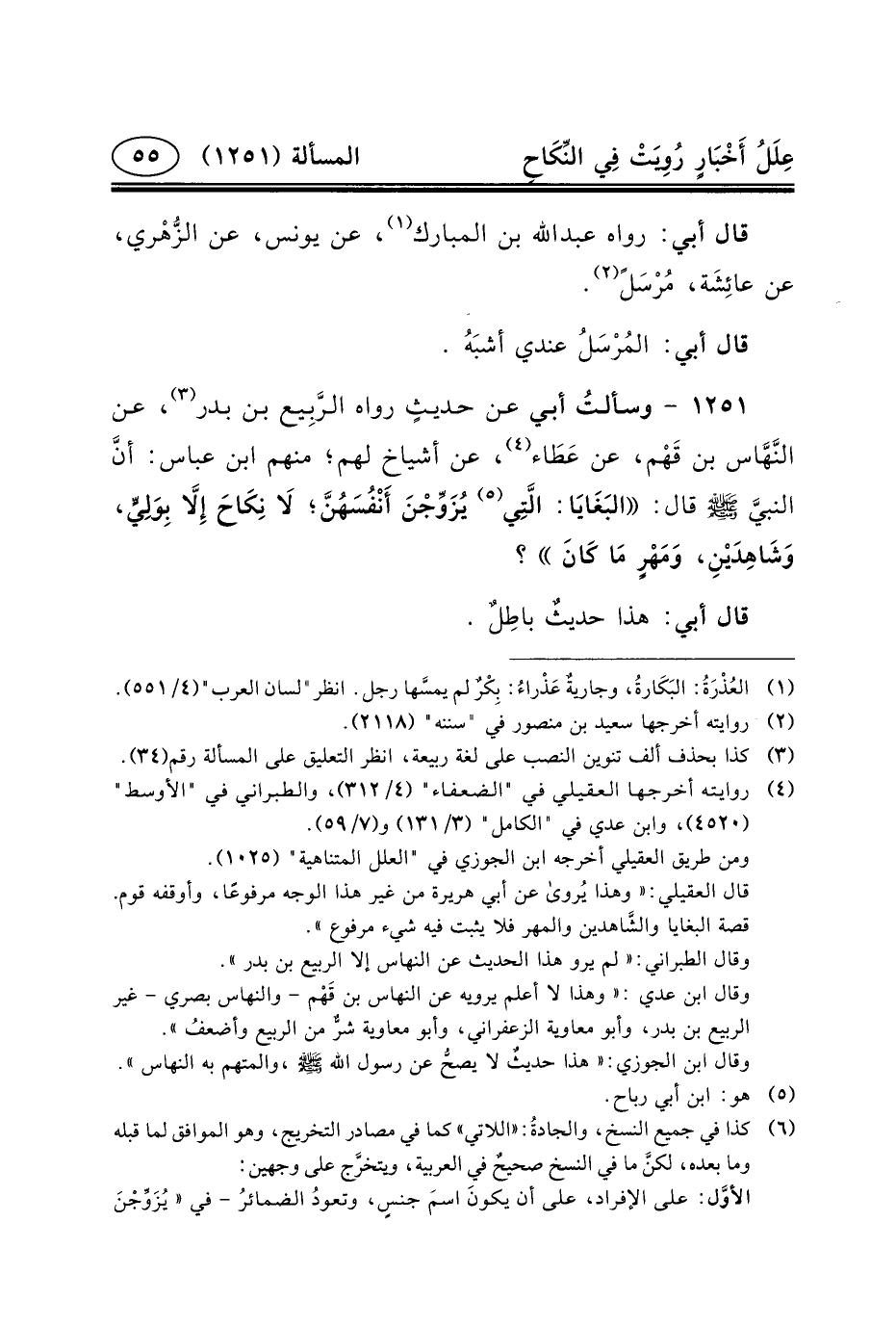 ١٢٥١ - وسألتُ أَبِي عَنْ حديثٍ رَوَاهُ الرَّبِيع بْنُ بَدْرٍ (٣) ، عَنِ النَّهَّاس بْنِ قَهْم، عَنْ عَطَاء (٤) ، عَنْ أَشْيَاخٍ لَهُمْ؛ مِنْهُمُ ابْنُ عَبَّاسٍ: أنَّ النبيَّ (ص) قال: البَغَايَا: الَّتِي (٥)