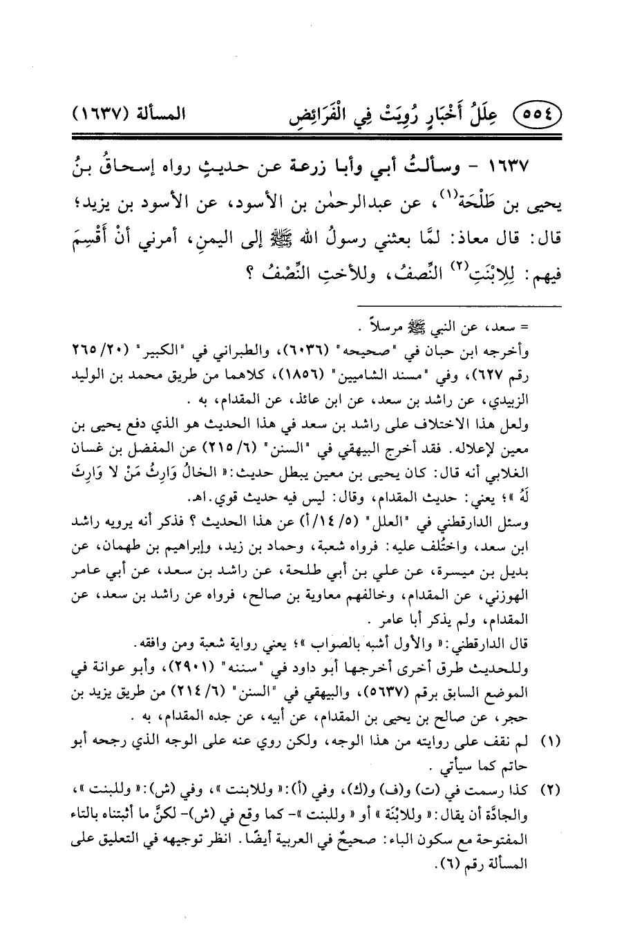 ١٦٣٧ - وسألتُ أَبِي وَأَبَا زُرْعَةَ عَنْ حديثٍ رَوَاهُ إسحاقُ بنُ يَحْيَى بن طَلْحَة (١) ، عن عبد الرحمن بْنِ الأَسْوَدِ، عَنِ الأَسْوَدِ بْنِ يَزِيدَ؛ قَالَ: قَالَ مُعَاذٌ: لمَّا بعثني رسولُ الله (ص) إِلَى اليمنِ، أَمَرَنِي أنْ أَقْسِمَ فيهم: لِلاِبْنَتِ (٢) النِّصفُ، وللأختِ النِّصْفُ؟