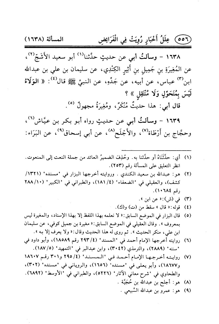 ١٦٣٨ - وسألتُ أَبِي عَنْ حديثٍ حدَّثنا (١) أَبُو سَعِيدٍ الأَشَجّ (٢) ، عَنِ المُغِيرَةِ بنِ جَمِيلِ بنِ أَثِيرٍ الكِنْدِي، عَنْ سُلَيْمَانَ بْنِ عَلِيِّ بْنِ عبد الله ابن (٣) عَبَّاسٍ، عَنْ أَبِيهِ، عَن جَدِّهِ، عن النبيِّ (ص) قال (٤) : الوَلَاءُ لَيْسَ بِمُتَحَوِّلٍ وَلَا مُنْتَقِلٍ؟