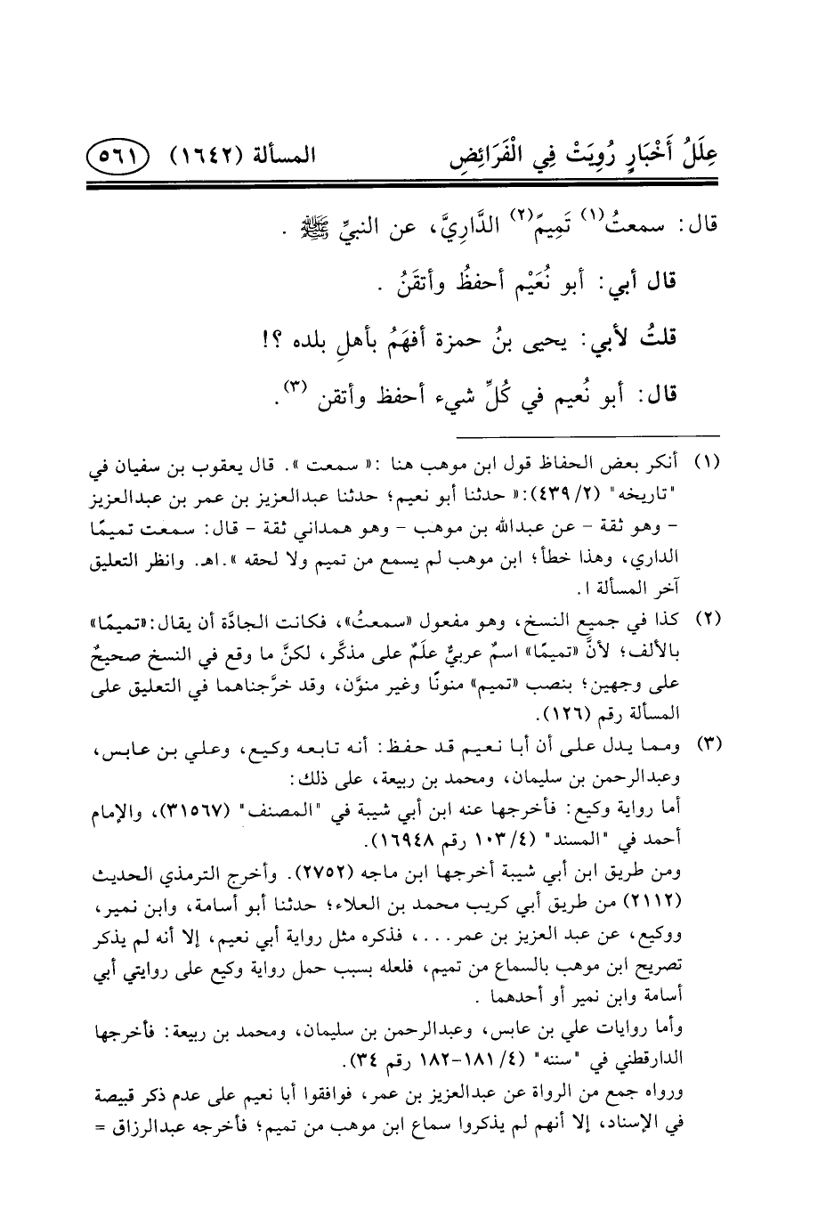 (٧) أنكر بعض الحفاظ قول ابن موهب هنا: «سمعت» . قال يعقوب بن سفيان في "تاريخه" (٢/٤٣٩) : «حدثنا أبو نعيم؛ حدثنا عبد العزيز بن عمر بن عبد العزيز - وهو ثقة - عن عبد الله بن موهب - وهو همداني ثقة - قال: سمعت تميمًا الداري، وهذا خطأ؛ ابن موهب لم يسمع من تميم ولا لحقه» . اهـ. وانظر التعليق آخر المسألة ا.