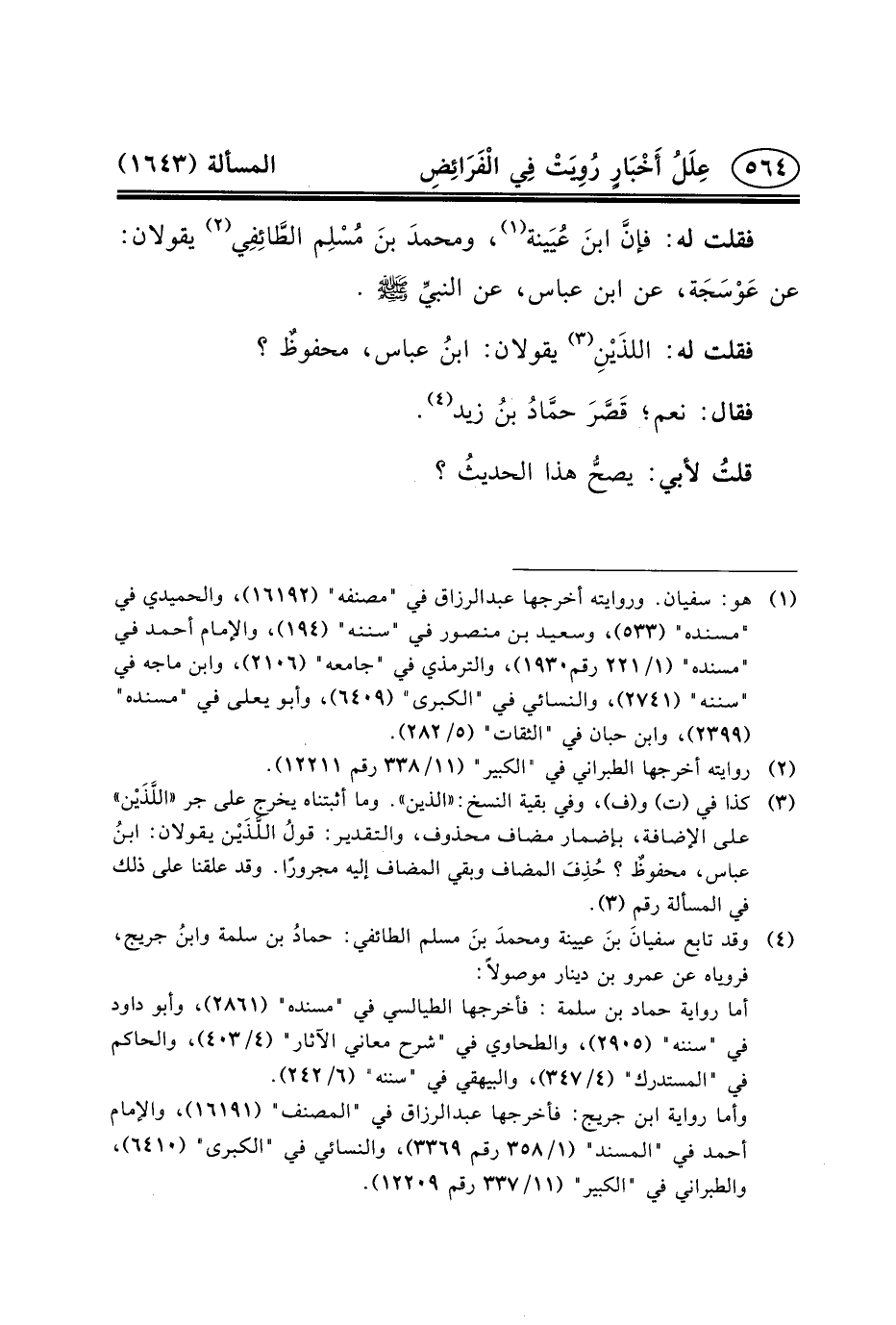 فَقُلْتُ لَهُ: فإنَّ ابنَ عُيَينة (١) ، ومحمدَ بنَ مُسْلِم الطَّائِفِي (٢) يَقُولانِ: عَنْ عَوْسَجَة، عَنِ ابْنِ عَبَّاسٍ، عن النبيِّ (ص) .