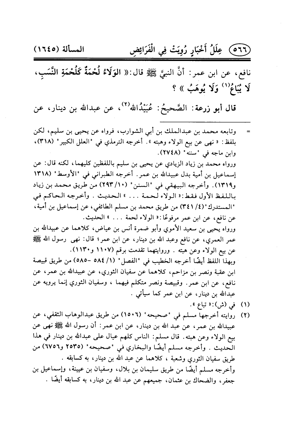نَافِعٍ، عَنِ ابْنِ عُمَرَ: أنَّ النبيَّ (ص) قَالَ: الوَلَاءُ لُحْمَةٌ كَلُحْمَةِ النَّسَبِ، لَا يُبَاعُ (١) وَلَا يُوهَبُ؟