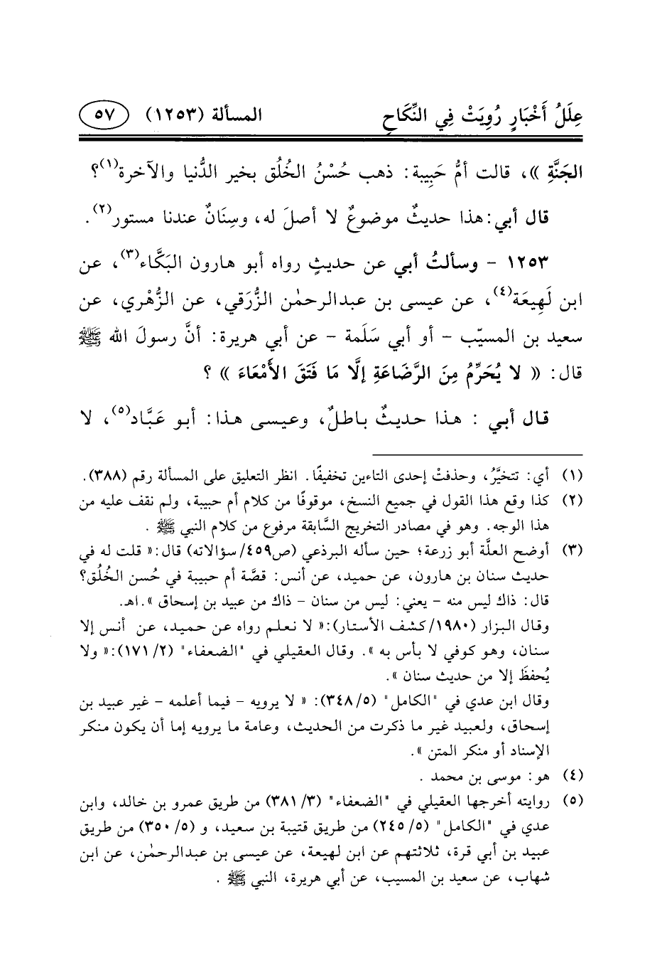 ١٢٥٣ - وسألتُ أَبِي عَنْ حديثٍ رَوَاهُ أَبُو هَارُونَ البَكَّاء (٣) ، عَنِ ابن لَهِيعَة (٤) ، عن عيسى ابن عبد الرحمن الزُّرَقي، عَنِ الزُّهْري، عَنْ سَعِيدِ بْنِ الْمُسَيِّبِ - أَوْ أَبِي سَلَمة - عَنْ أَبِي هُرَيْرَةَ: أنَّ رسولَ الله (ص) قَالَ: لا يُحَرِّمُ مِنَ الرَّضَاعَةِ إلَاّ مَا فَتَقَ الأَمْعَاءَ؟