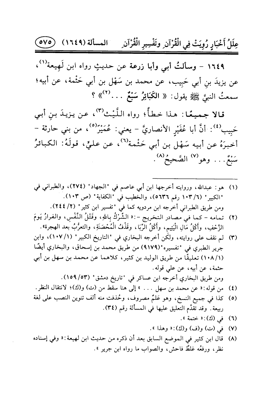 ١٦٤٩- وسألتُ أَبِي وَأَبَا زُرْعَةَ عَنْ حديثٍ رَوَاهُ ابْنُ لَهِيعة (١) ، عَنِ يزيدَ بنِ أَبِي حَبِيب، عَنْ مُحَمَّدِ بْنِ سَهْل بْنِ أَبِي حَثْمة، عَنْ أَبِيهِ؛ سمعتُ النبيَّ (ص) يَقُولُ: الكَبَائِرُ سَبْعٌ ... (٢) ؟