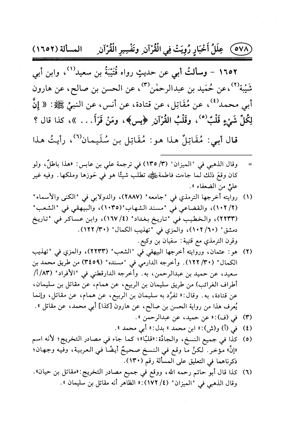 ١٦٥٢ - وسألتُ أَبِي عَنْ حديثٍ رَوَاهُ قُتَيْبَةُ ابن سَعِيدٍ (١) ،