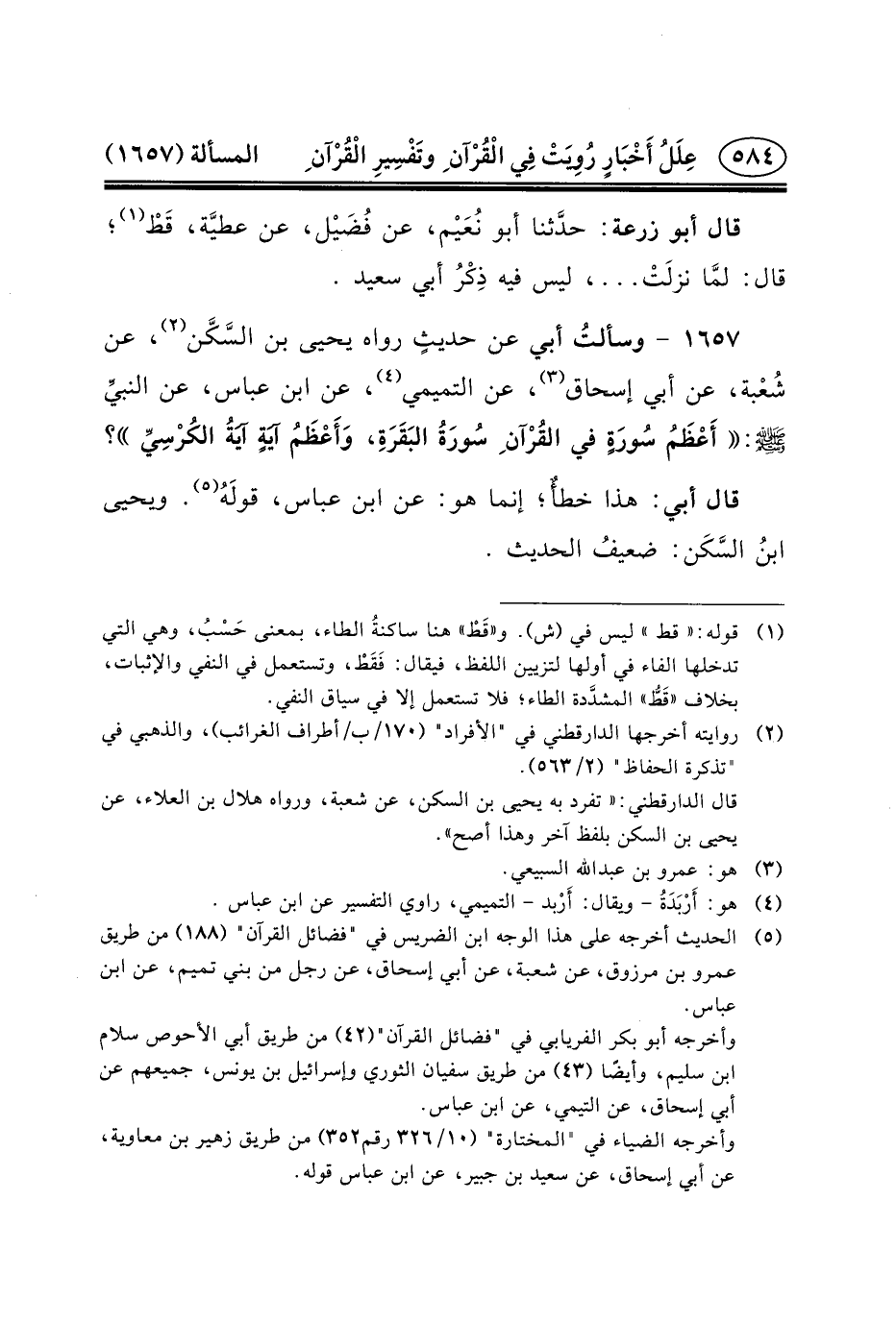 ١٦٥٧ - وسألتُ أَبِي عَنْ حديثٍ رَوَاهُ يَحْيَى بْنُ السَّكَّن (٢) ، عَنْ شُعْبة، عَنْ أَبِي إِسْحَاقَ (٣) ، عَنِ التَّمِيمِيِّ (٤) ، عَنِ ابْنِ عباس، عن النبيِّ (ص) : أَعْظَمُ سُورَةٍ في القُرْآن ِ سُورَةُ البَقَرَةِ، وَأَعْظَمُ آيَةٍ آيَةُ الكُرْسِيِّ؟