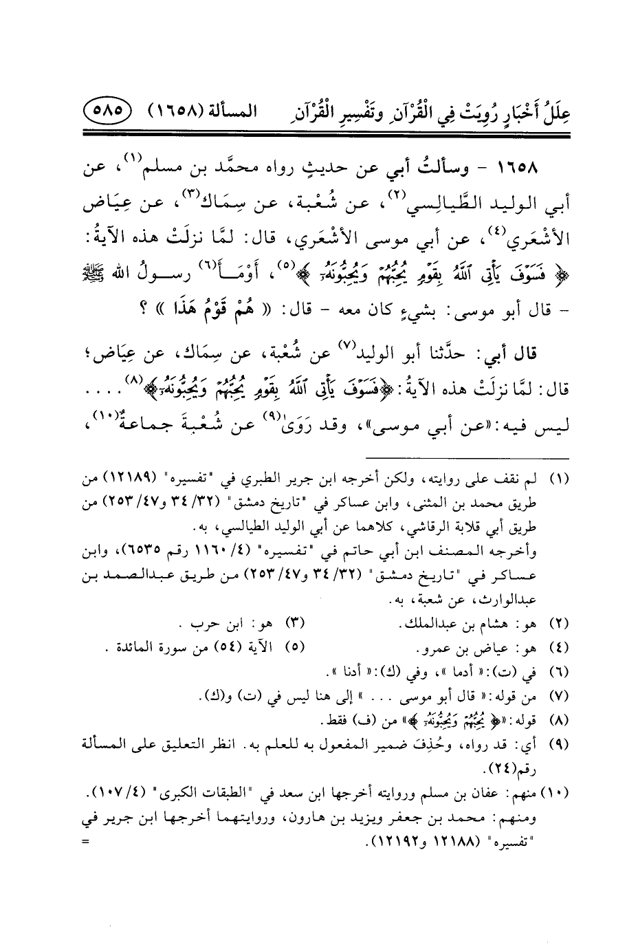 ١٦٥٨ - وسألتُ أَبِي عَنْ حديثٍ رَوَاهُ محمَّد بْنُ مُسْلِمٍ (١) ، عَنْ أَبِي الْوَلِيدِ الطَّيالِسي (٢) ، عَنْ شُعْبة، عَنْ سِمَاك (٣) ، عَنْ عِيَاض الأشْعَري (٤) ، عَنْ أَبِي مُوسَى الأشْعَري، قَالَ: لمَّا نزلَتْ هَذِهِ الآيةُ: {فَسَوْفَ يَأْتِي اللَّهُ بِقَوْمٍ يُحِبُّهُمْ وَيُحِبُّونَهُ} (٥) ، أَوْمَأَ (٦) رسولُ الله (ص) - قال أبو موسى: بشيءٍ كان معه - قال: هُمْ قَوْمُ هَذَا؟