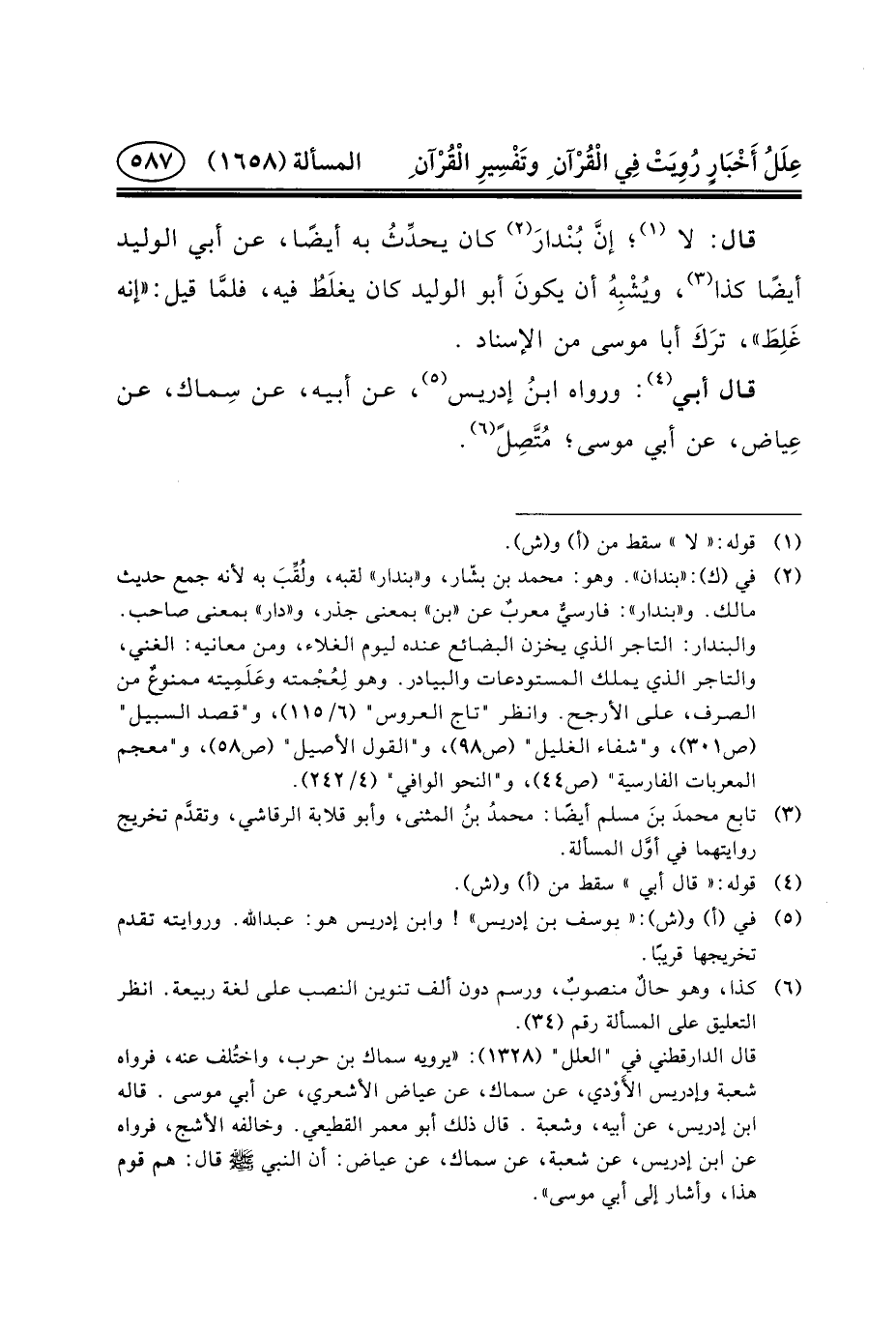 قَالَ: لا (١) ؛ إنَّ بُنْدارَ (٢) كَانَ يحدِّثُ به أيضا، عَنْ أبي الوليد أيضًا كذا (٣) ، ويُشْبِهُ أن يكونَ أَبُو الْوَلِيد كَانَ يغلَطُ فيه، فلمَّا قيل: «أنه غَلِطَ» ، ترَكَ أَبَا مُوسَى من الإسناد.