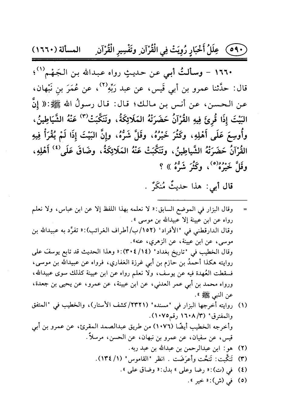 ١٦٦٠ - وسألتُ أَبِي عَنْ حديثٍ رَوَاهُ عبد الله بْنُ الجَهْم (١) ؛ قَالَ: حدَّثنا عَمْرُو بْنُ أَبِي قَيس، عَنْ عَبْدِ رَبِّهِ (٢) ، عَنْ عُمَرَ بنِ نَبْهان، عَنِ الْحَسَنِ، عَنْ أَنَسِ بْنِ مَالِكٍ؛ قَالَ: قَالَ رسولُُ اللَّهِ (ص) : إِنَّ البَيْتَ إِذَا قُرِئَ فِيهِ القُرْآنُ حَضَرَتْهُ المَلَائِكَةُ، وتَنَكَّبَتْ (٣) عَنْهُ الشَّيَاطِينُ، وأُوسِعَ عَلَى أَهْلِهِ، وكَثُرَ خَيْرُهُ، وقَلَّ شَرُّهُ، وإِنَّ البَيْتَ إِذَا لَمْ يُقْرَأْ فِيهِ القُرْآنُ حَضَرَتْهُ الشَّياطِينُ، وتَنَكَّبَتْ عَنْهُ المَلَائِكَةُ، وضَاقَ عَلَى (٤) أَهْلِهِ، وقَلَّ خَيْرُهُ (٥) ، وكَثُرَ شَرُّهُ؟