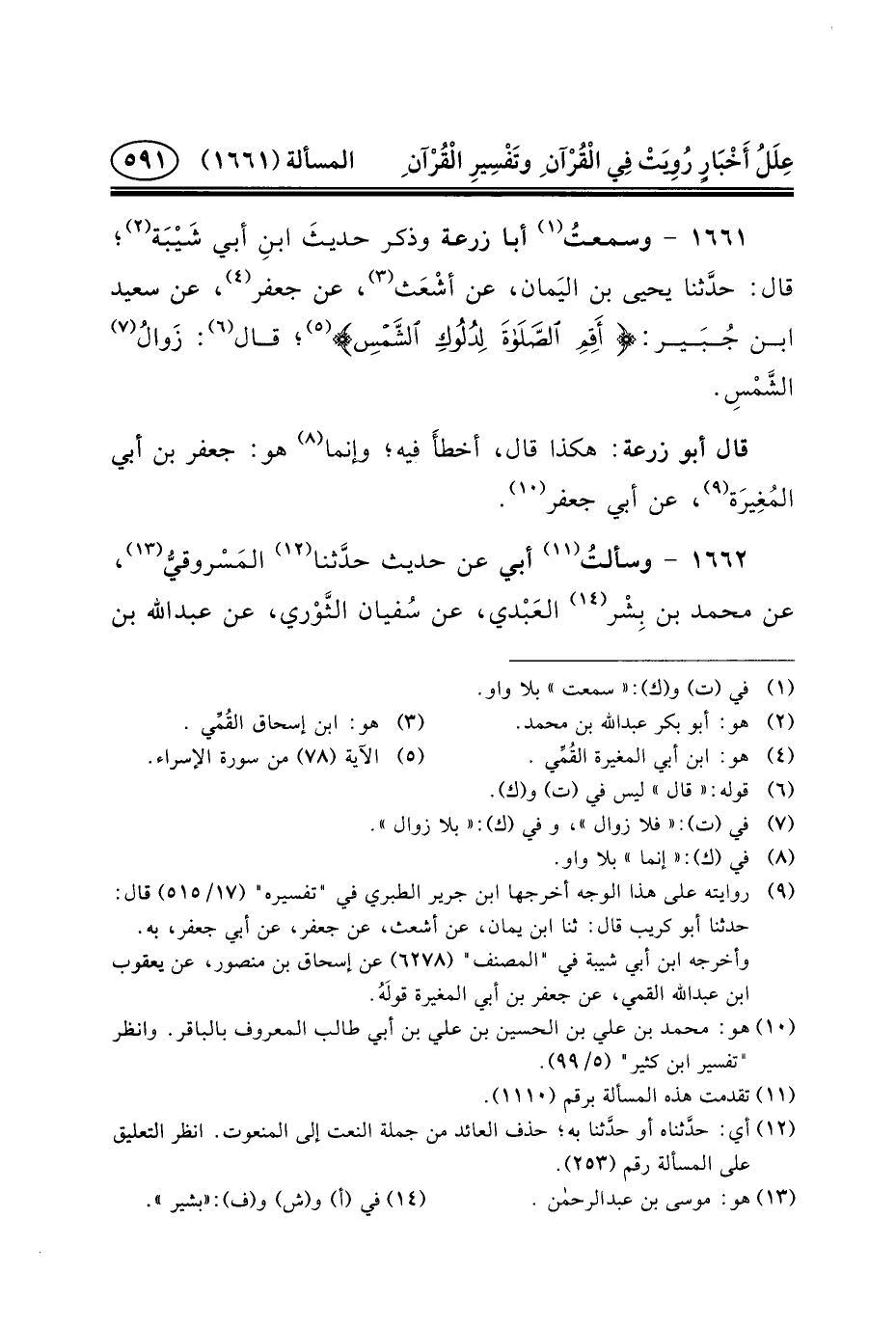 ١٦٦١ - وسمعتُ (١) أَبَا زُرْعَةَ وَذَكَرَ حديثَ ابنِ أَبِي شَيْبَة (٢) ؛ قَالَ: حدَّثنا يحيى بن اليَمان، عن أشْعَث (٣) ، عَنْ جَعْفَرٍ (٤) ، عَنْ سَعِيدِ بْنِ جُبَير {أَقِمِ الصَّلَاةَ لِدُلُوكِ الشَّمْسِ} (٥) ؛ قَالَ (٦) : زَوالُ (٧) الشَّمْسِ.