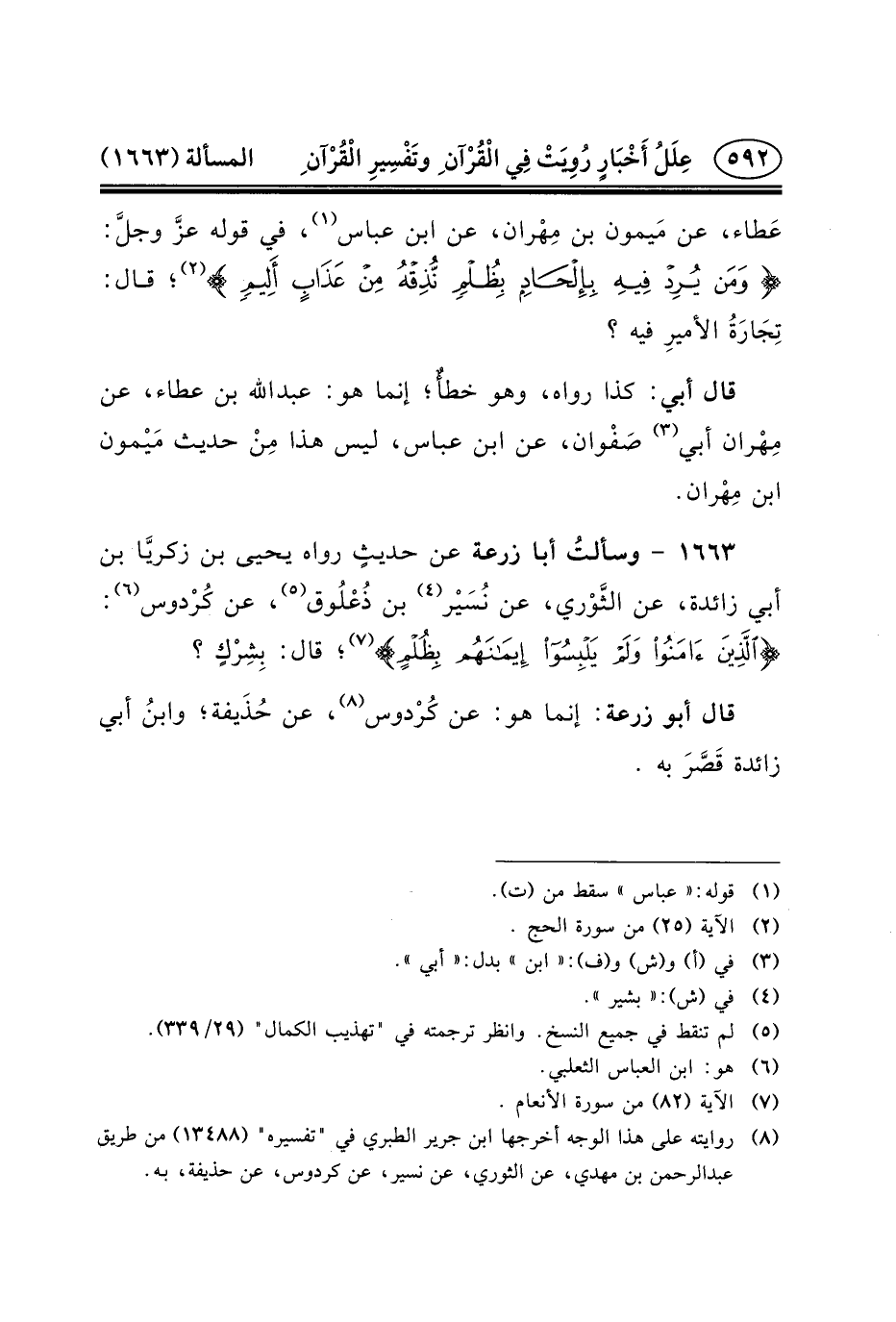 ١٦٦٣ - وسألتُ أَبَا زُرْعَةَ عَنْ حديثٍ رَوَاهُ يَحْيَى بْنُ زكريَّا بْنِ أَبِي زَائِدَةَ، عَنِ الثَّوْري، عَنْ نُسَيْر (٤) بْنِ ذُعْلُوق (٥) ، عَنْ كُرْدوس (٦) : {الَّذِينَ آمَنُوا وَلَمْ يَلْبِسُوا إِيمَانَهُمْ بِظُلْمٍ} (٧) ؛ قَالَ: بِشِرْكٍ؟
