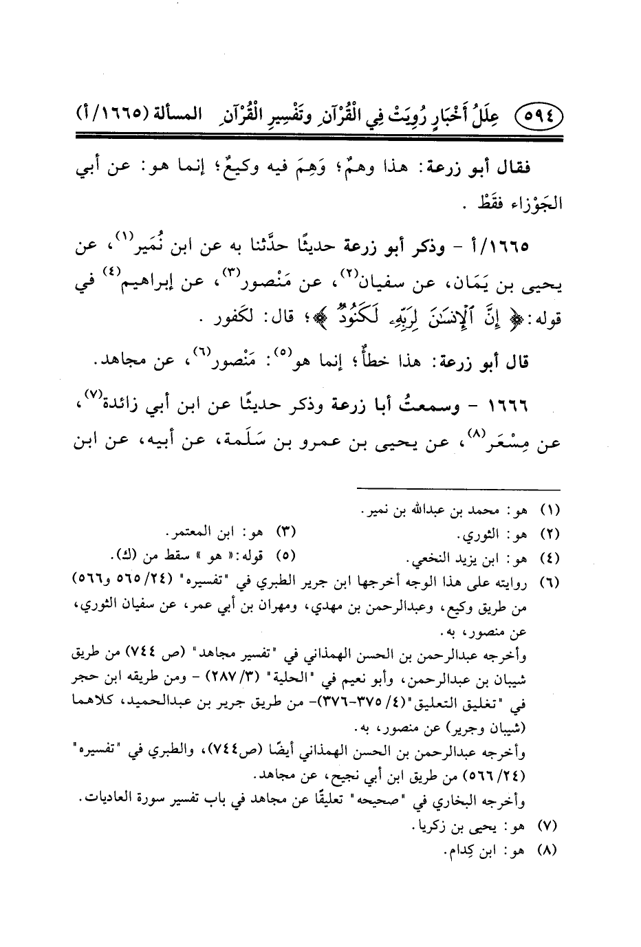 ١٦٦٥/أ - وَذَكَرَ أَبُو زُرْعَةَ حَدِيثًا حدَّثنا بِهِ عَنِ ابْنِ نُمَير (١) ، عَنْ يَحْيَى بْنِ يَمَان، عَنْ سُفْيَانَ (٢) ، عَنْ مَنْصور (٣) ، عَنْ إِبْرَاهِيمَ (٤) فِي قَوْلِهِ: {إِنَّ الإِْنْسَانَ لِرَبِّهِ لَكَنُودٌ *} ؛ قَالَ: لكَفور.
