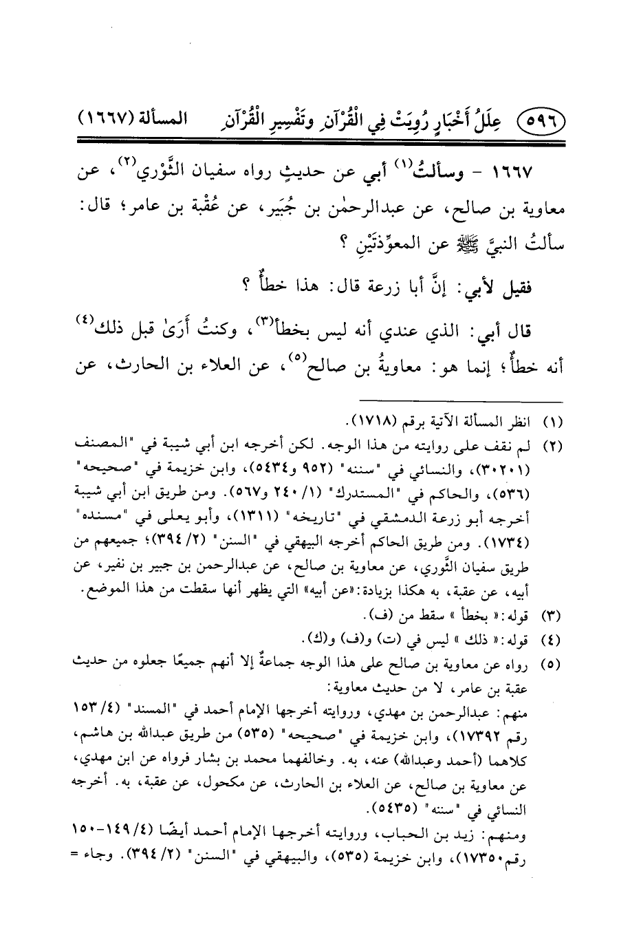 ١٦٦٧ - وسألتُ (١) أَبِي عَنْ حديثٍ رَوَاهُ سُفْيَانُ الثَّوْري (٢) ، عَنْ مُعَاوِيَةَ بْنِ صالح، عن عبد الرحمن بْنِ جُبَير، عَنْ عُقْبة بْنِ عامر؛ قال: سألتُ النبيَّ (ص) عَنِ المعوِّذتَيْنِ؟