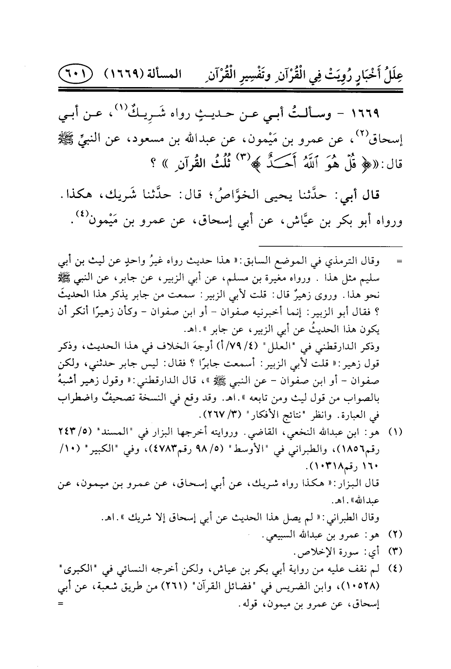 ١٦٦٩ - وسألتُ أَبِي عَنْ حديثٍ رَوَاهُ شَرِيكٌ (١) ، عَنْ أَبِي إِسْحَاقَ (٢) ، عَنِ عمرو بن مَيْمون، عن عبد الله بن مسعود، عن النبيِّ (ص) قَالَ: {قُلْ هُوَ اللَّهُ أَحَدٌ *} (٣) ثُلُثُ القُرآن ِ؟