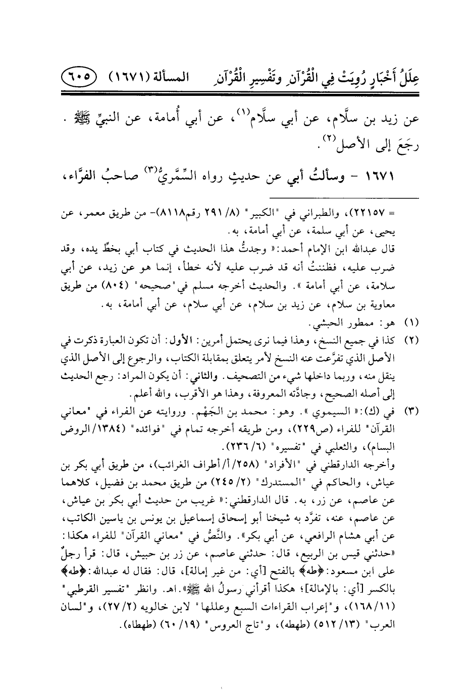 وأخرجه الدارقطني في "الأفراد" (٢٥٨/أ/أطراف الغرائب) ، من طريق أبي بكر بن عياش، والحاكم في "المستدرك" (٢/٢٤٥) من طريق محمد بن فضيل، كلاهما عن عاصم، عن زر، به. قال الدارقطني: «غريب من حَدِيثَ أَبِي بَكْرِ بْنِ عَيَّاشٍ، عن عاصم، عنه، تفرَّد به شيخنا أبو إسحاق إسماعيل بن يونس بن ياسين الكاتب، عن أبي هشام الرافعي، عن أبي بكر» . والنَّصُّ في "معاني القرآن" للفراء هكذا: «حدثني قيس ابن الربيع، قال: حدثني عاصم، عن زر بن حبيش، قال: قرأ رجلٌ على ابن مسعود: {طه} بالفتح [أي: من غير إمالة] ، قال: فقال له عبد الله: {طه} بالكسر [أي: بالإمالة] ؛ هكذا أقرأني رسولُ الله (ص) » . اهـ. وانظر "تفسير القرطبي" (١١/١٦٨) ، و"إعراب = = القراءات السبع وعللها" لابن خالويه (٢/٢٧) ، و"لسان العرب" (١٣/٥١٢) (طهطه) ، و"تاج العروس" (١٩/٦٠) (طهطاه) .