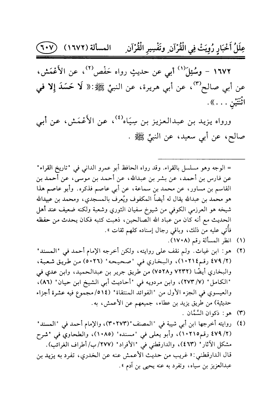 ١٦٧٢ - وسُئِلَ (١) أَبِي عَنْ حديثٍ رَوَاهُ حَفْص (٢) ، عَنِ الأَعْمَش، عَنْ أَبِي صَالِحٍ (٣) ، عَنْ أَبِي هُرَيْرَةَ، عَنِ النبيِّ (ص) : لَا حَسَدَ إِلا فِي اثْنَتَيْنِ ... .