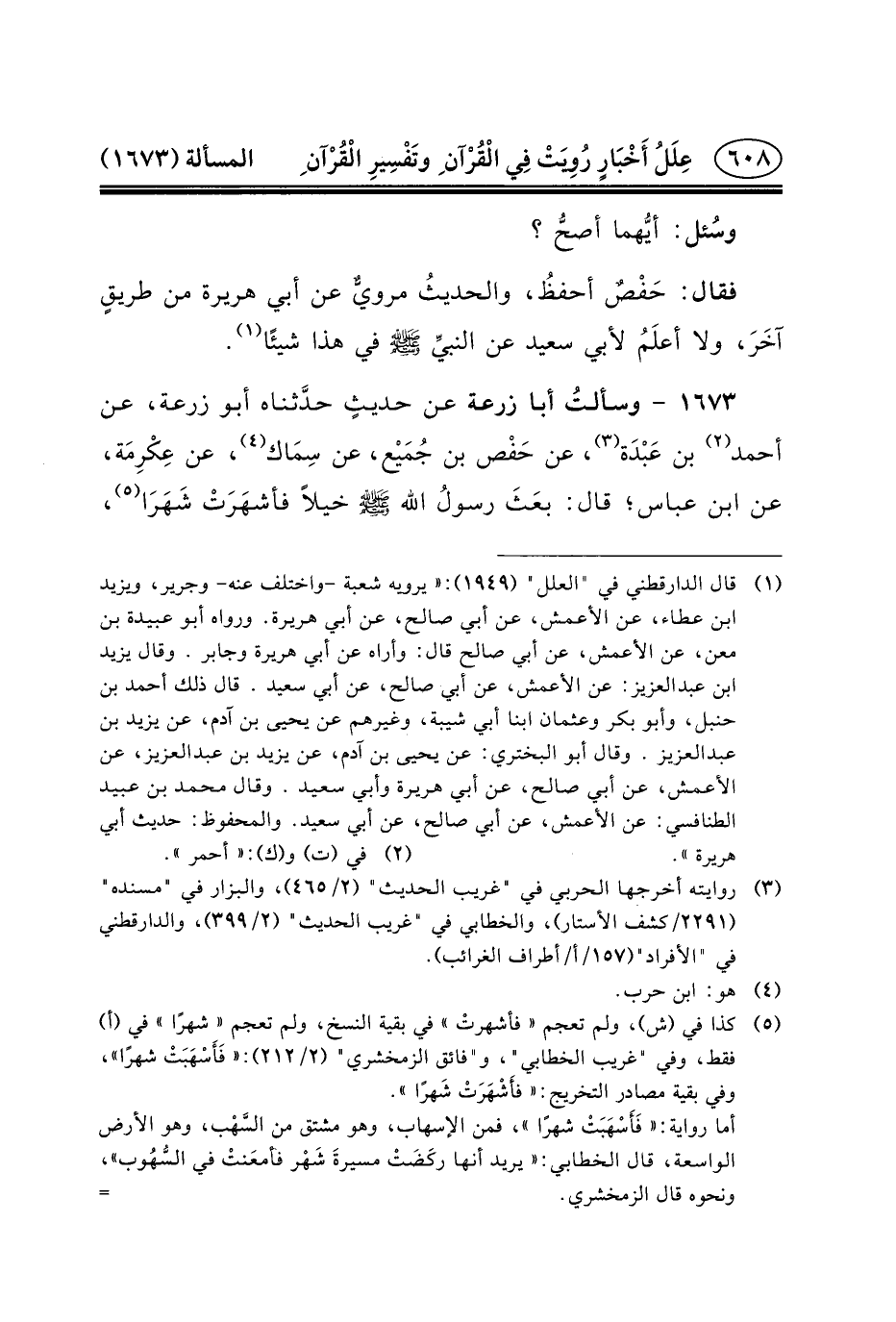 ١٦٧٣- وسألتُ أَبَا زُرْعَةَ عَنْ حديثٍ حدَّثناه أَبُو زُرْعَةَ، عَنْ أَحْمَدَ (٢) بْنِ عَبْدَة (٣) ، عن حَفْص ابن جُمَيْع، عَنْ سِمَاك (٤) ، عَنْ عِكْرِمَة، عَنِ ابْنِ عَبَّاسٍ؛ قَالَ: بعَثَ رسولُ الله (ص) خيلاً فأشهَرَتْ شَهَرَا (٥) ،