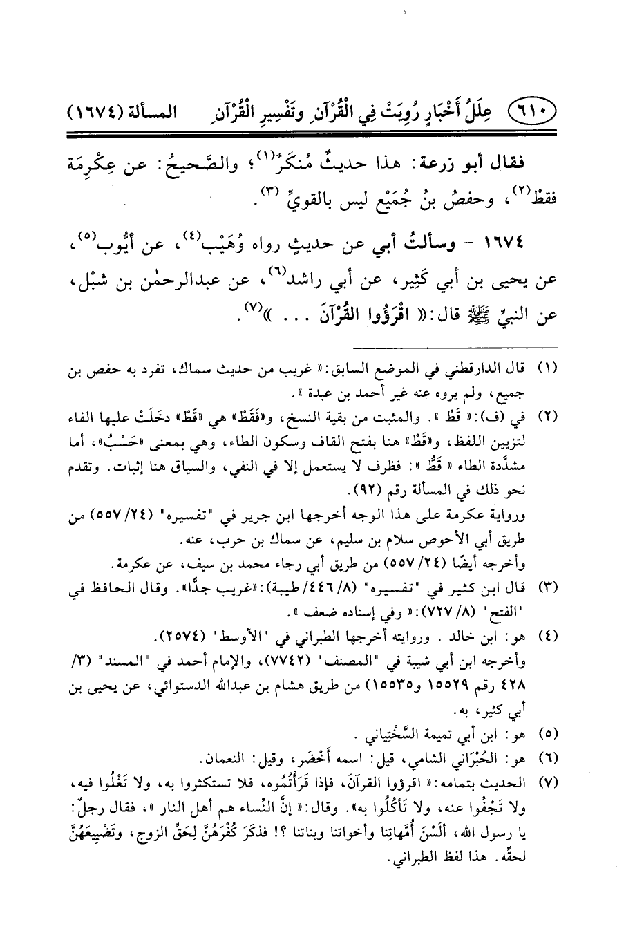 فَقَالَ أَبُو زُرْعَةَ: هَذَا حديثٌ مُنكَرٌ (١) ؛ والصَّحيحُ: عَنْ عِكْرِمَة فقطْ (٢) ، وحفصُ بنُ جُمَيْع لَيْسَ بالقويِّ (٣) .