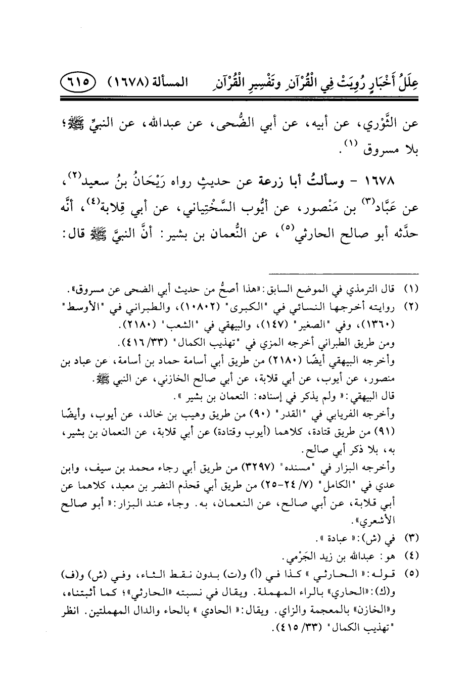 عَنْ عَبَّاد (٣) بْنِ مَنْصور، عَنْ أيُّوب السَّخْتِياني، عَنْ أَبِي قِلابة (٤) ، أنَّه حدَّثه أَبُو صَالِحٍ الْحَارِثِيُّ (٥) ، عَنِ النُّعمان بْنِ بَشِيرٍ: أنَّ النبيَّ (ص) قال: