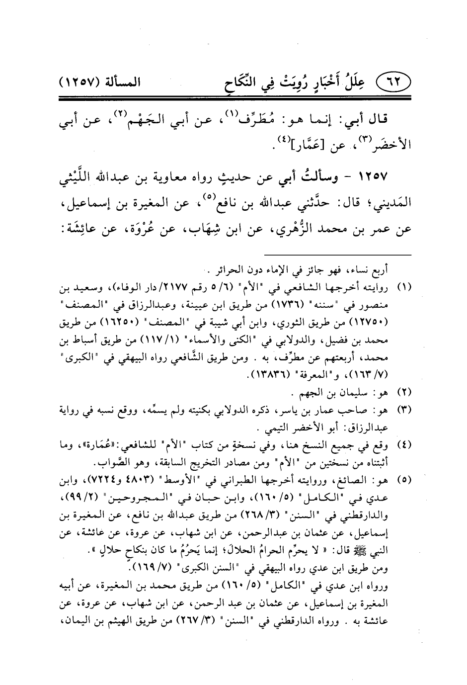 (١) روايته أخرجها الشافعي في "الأم" (٦/٥ رقم ٢١٧٧/دار الوفاء) ، وسعيد بن منصور في "سننه" (١٧٣٦) من طريق ابن عيينة، وعبد الرزاق في "المصنف" (١٢٧٥٠) من طريق الثوري، وابن أبي شيبة في "المصنف" (١٦٢٥٠) من طريق محمد بن فضيل، والدولابي في "الكنى والأسماء" (١/١١٧) من طريق أسباط بن محمد، أربعتهم عن مطرِّف، به. ومن طريق الشَّافعي رواه البيهقي في "الكبرى" (٧/١٦٣) ، و"المعرفة" (١٣٨٣٦) .