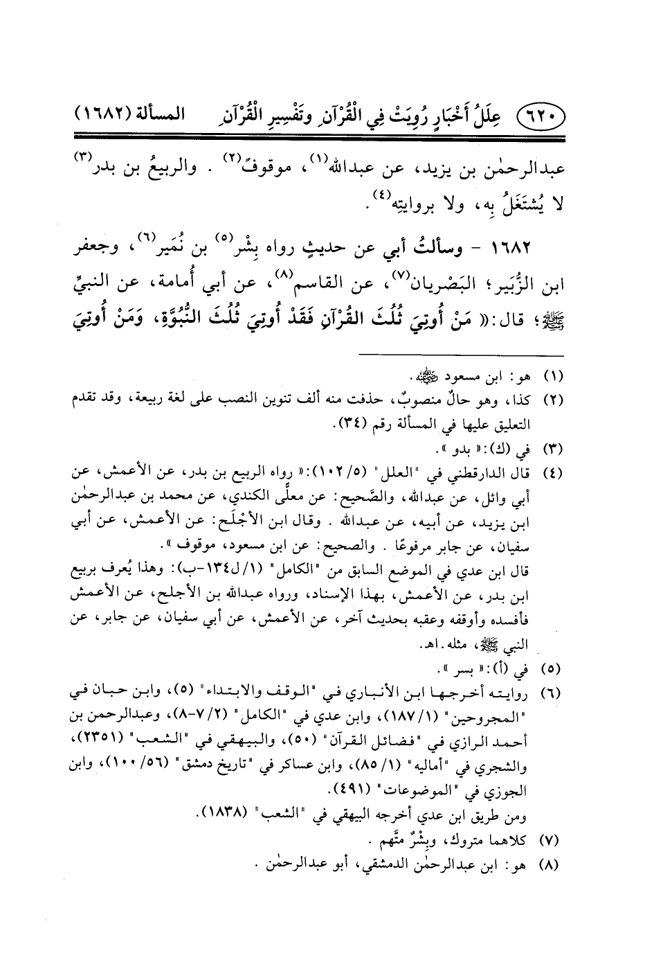 (٤) قال الدارقطني في "العلل" (٥/١٠٢) : «رواه الربيع ابن بَدْرٍ، عَنِ الأَعْمَشِ، عَنْ أَبِي وائل، عن عبد الله، والصَّحيح: عن معلًّى الكندي، عن محمد بن عبد الرحمن بْنِ يَزِيدَ، عَنْ أَبِيهِ، عَنْ عبد الله. وقال ابن الأجْلَح: عَنِ الأَعْمَشِ، عَنْ أَبِي سُفْيَانَ، عن جابر مرفوعًا. والصحيح: عن ابن مسعود، موقوف» .
