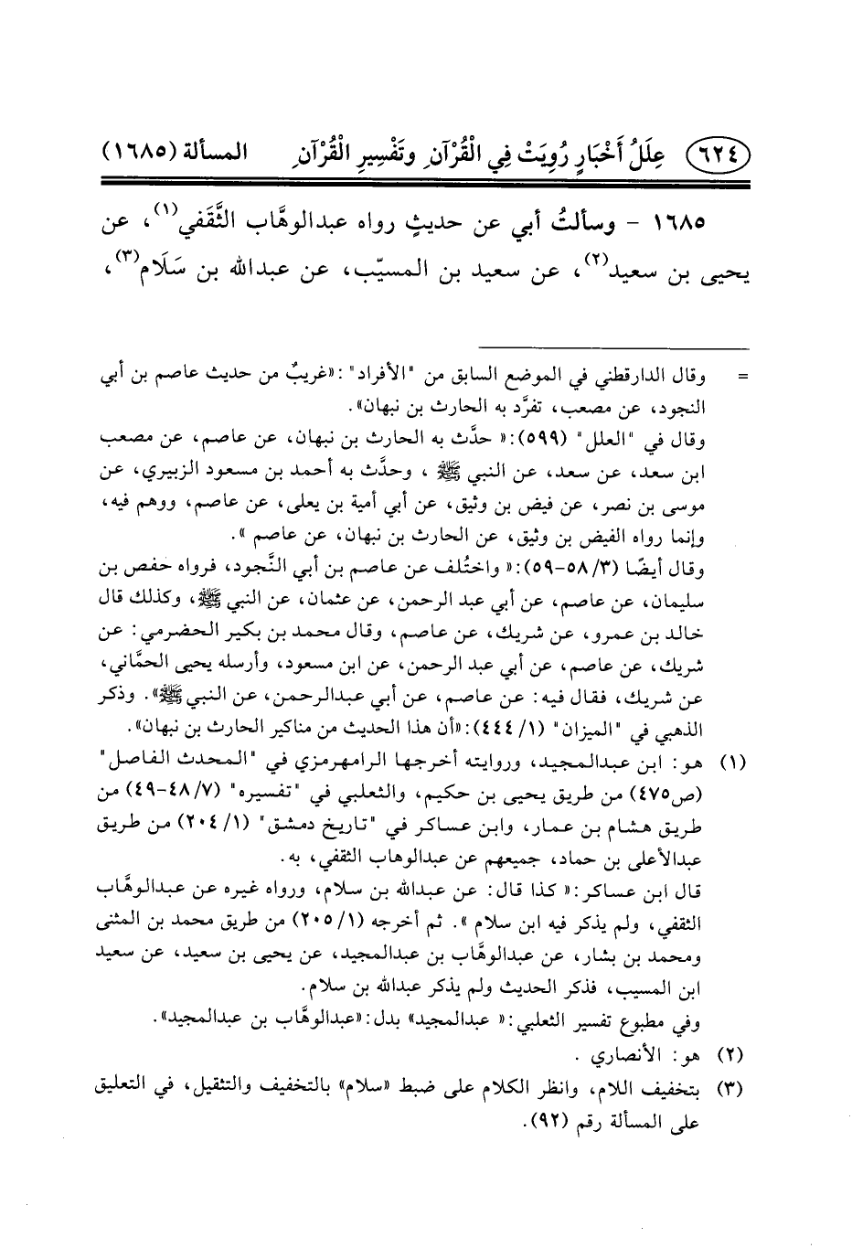 ١٦٨٥ - وسألتُ أَبِي عَنْ حديثٍ رَوَاهُ عبد الوهَّاب الثَّقَفي (١) ، عَنْ يَحْيَى بْنِ سَعِيدٍ (٢) ، عَنْ سَعِيدِ بْنِ الْمُسَيَّبِ، عَنْ عبد الله بن سَلَام (٣) ،