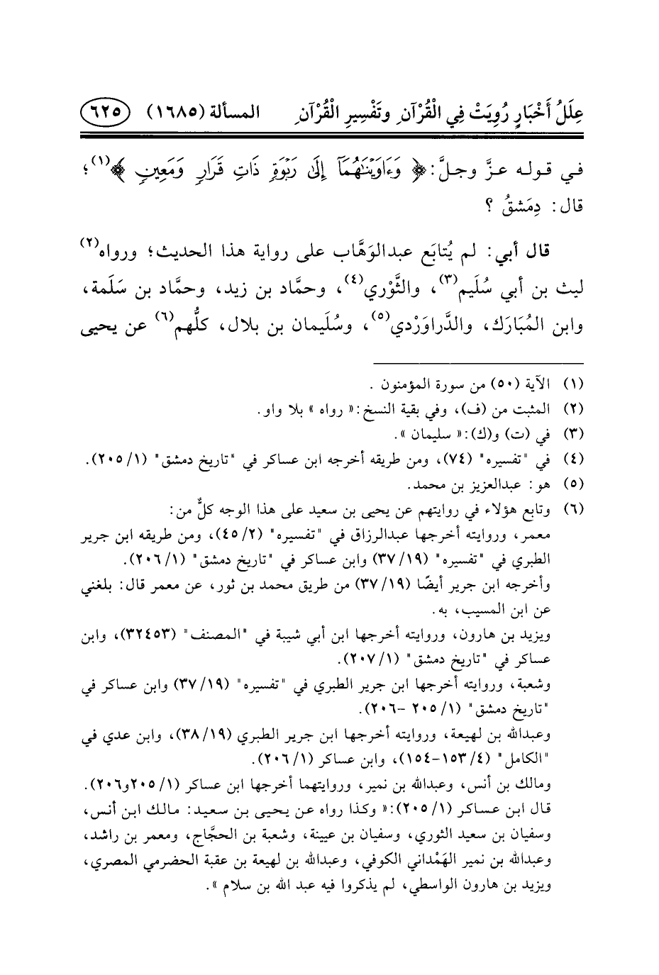 فِي قَوْلِهِ عزَّ وجلَّ: {وَآوَيْنَاهُمَا إِلَى رَبْوَةٍ ذَاتِ قَرَارٍ وَمَعِينٍ} (١) ؛ قَالَ: دِمَشقُ؟