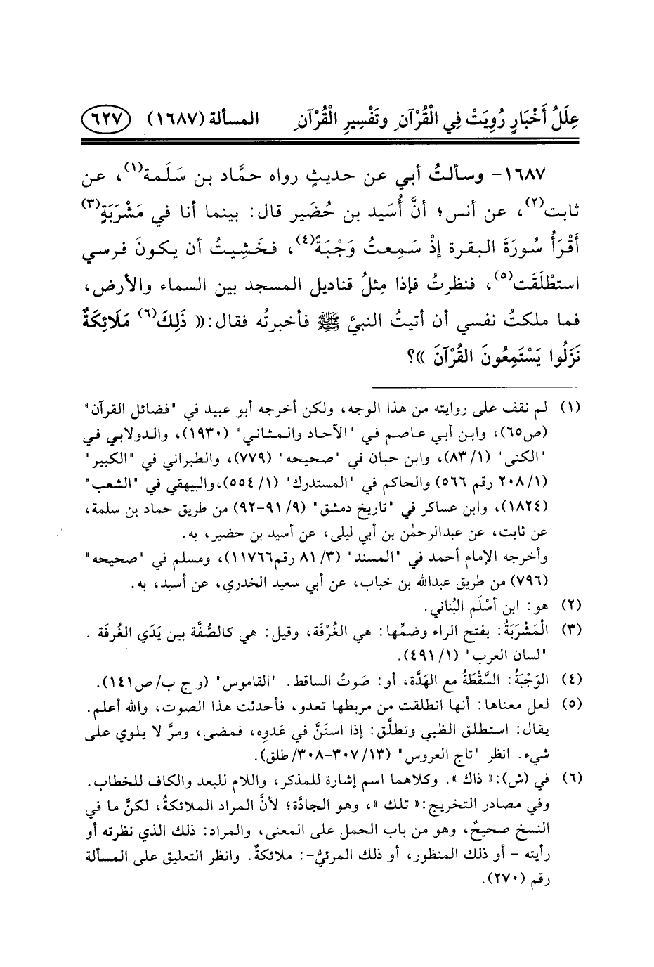 عَنْ ثَابِتٍ (٢) ، عَنْ أَنَسٍ؛ أنَّ أُسَيد بْنَ حُضَير قَالَ: بَيْنَمَا أَنَا فِي مَشْرَبَةٍ (٣) أَقْرَأُ سُورَةَ البقرة إذْ سَمِعتُ وَجْبَةً (٤) ، فخَشِيتُ أَنْ يكونَ فَرَسِي استطْلَقَت (٥) ، فنظرتُ فَإِذَا مِثلُ قَنَادِيلِ الْمَسْجِدِ بَيْنَ السَّمَاءِ وَالأَرْضِ، فَمَا ملكتُ نَفْسِي أَنْ أتيتُ النبيَّ (ص) فأخبرتُه فَقَالَ: ذَلِكَ (٦) مَلَائِكَةٌ نَزَلُوا يَسْتَمِعُونَ القُرْآنَ؟