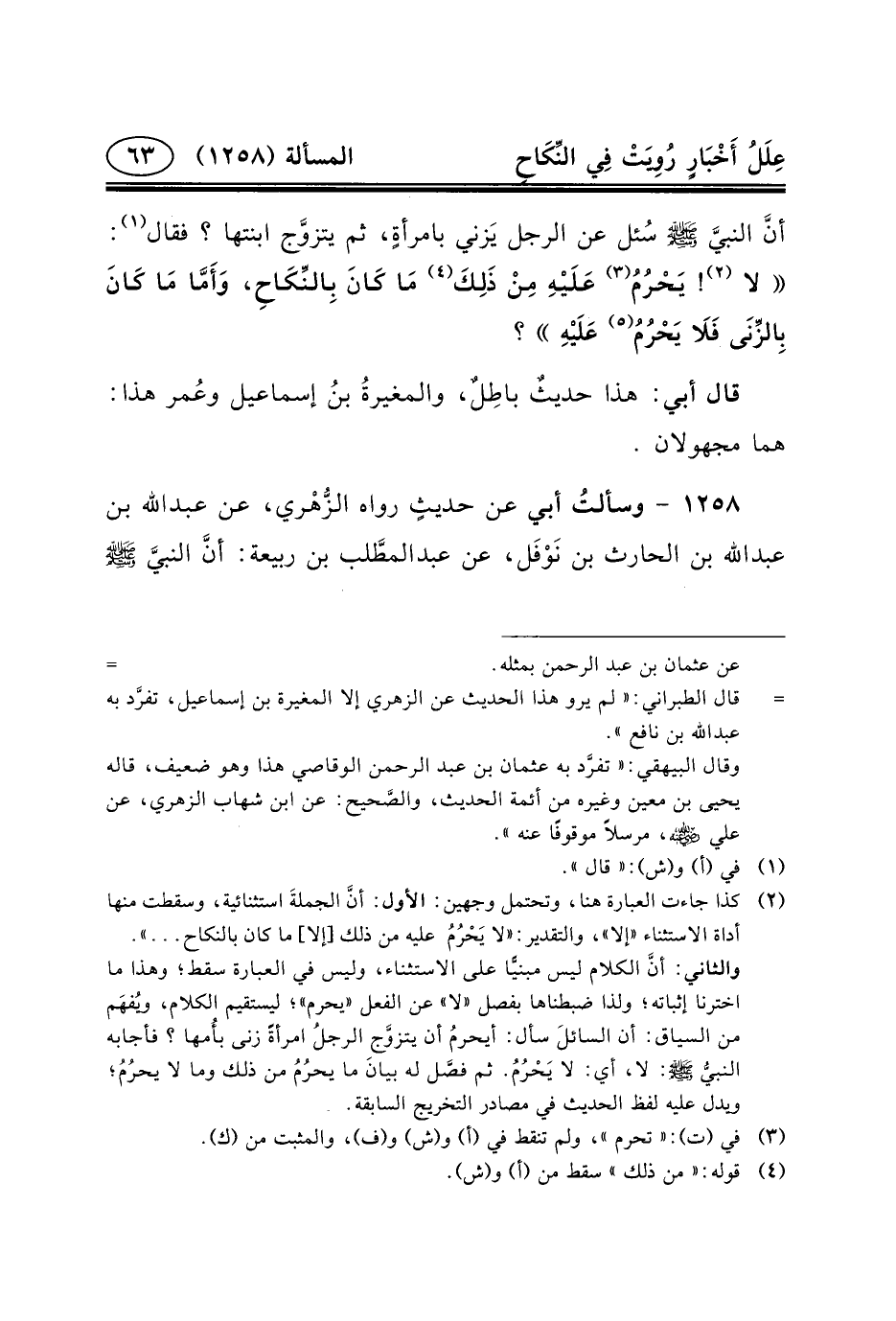 ١٢٥٨ - وسألتُ أَبِي عَنْ حديثٍ رَوَاهُ الزُّهْري، عَنْ عبد الله بن عبد الله بْنِ الْحَارِثِ بْنِ نَوْفَل، عَنْ عبد المطَّلب بن ربيعة: أنَّ النبيَّ (ص)