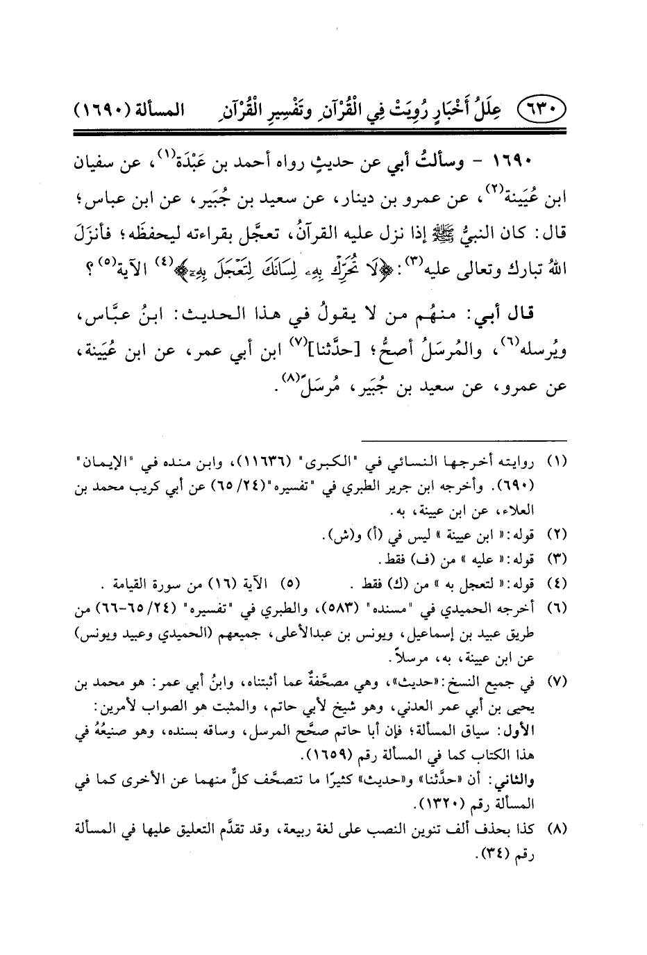 ١٦٩٠ - وسألتُ أَبِي عَنْ حديثٍ رَوَاهُ أَحْمَدُ بْنُ عَبْدَة (١) ، عَنْ سُفْيَانَ بن عُيَينة (٢) ، عَنْ عَمْرِو بْنِ دِينَارٍ، عَنْ سَعِيدِ بْنِ جُبَير، عَنِ ابْنِ عَبَّاسٍ؛ قَالَ: كَانَ النبيُّ (ص) إِذَا نَزَلَ عَلَيْهِ القرآنُ، تعجَّل بِقِرَاءَتِهِ ليحفظَه؛ فأنزَلَ اللهُ تَبَارَكَ وتعالى عليه (٣) : {لَا تُحَرِّكْ بِهِ لِسَانَكَ لِتَعْجَلَ بِهِ *} (٤) الآيَةُ (٥) ؟