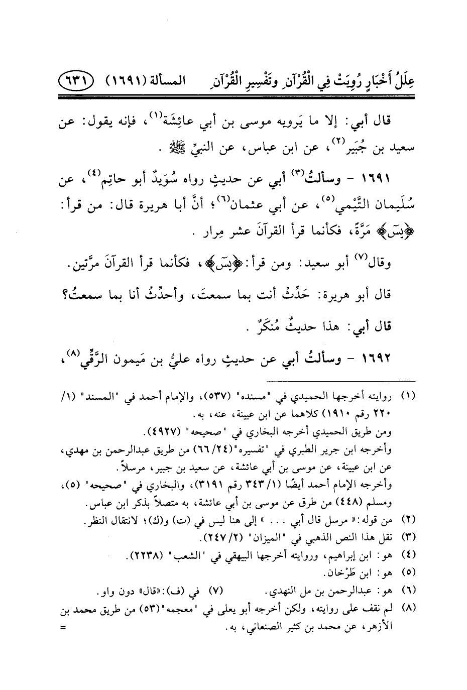 ١٦٩١ - وسألتُ (٣) أَبِي عَنْ حديثٍ رَوَاهُ سُوَيدٌ أَبُو حاتِم (٤) ، عَنْ سُلَيمان التَّيْمي (٥) ، عَنْ أَبِي عُثْمَانَ (٦) ؛ أنَّ أَبَا هُرَيْرَةَ قَالَ: مَنْ قَرَأَ: {يس *} مَرَّةً، فَكَأَنَّمَا قَرَأَ القرآنَ عَشْرَ مِرار.