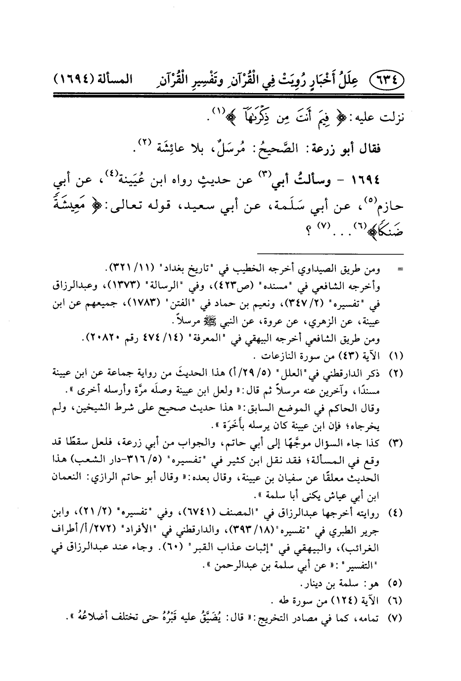 ١٦٩٤ - وسألتُ أَبِي (٣) عَنْ حديثٍ رَوَاهُ ابْنُ عُيَينة (٤) ، عَنْ أَبِي حَازِمٍ (٥) ، عَنْ أَبِي سَلَمة، عَنْ أَبِي سَعِيدٍ، قَوْلُهُ تَعَالَى: {مَعِيشَةً ضَنكًا} (٦) ... (٧) ؟