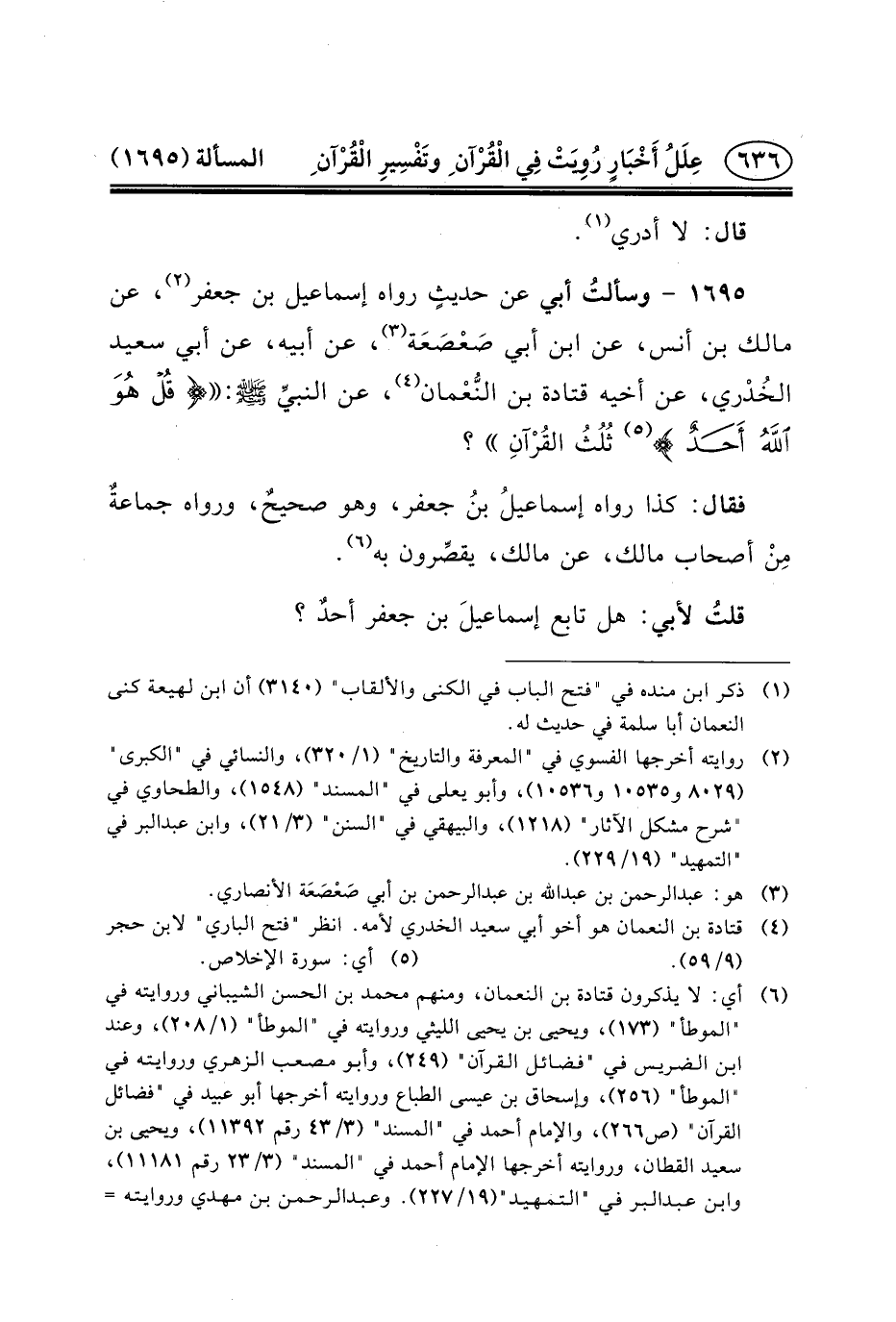 ١٦٩٥ - وسألتُ أَبِي عَن حديثٍ رَوَاهُ إِسْمَاعِيلُ بْنُ جَعْفَرٍ (٢) ، عَنْ مَالِكِ بْنِ أَنَسٍ، عَنِ ابْنِ أَبِي صَعْصَعَة (٣) ، عَنْ أَبِيهِ، عَنْ أَبِي سَعِيدٍ الخُدْري، عن أخيه قتادة بن النُّعْمان (٤) ، عن النبيِّ (ص) : {قُلْ هُوَ اللَّهُ أَحَدٌ *} (٥) ثُلُثُ القُرْآنِ؟