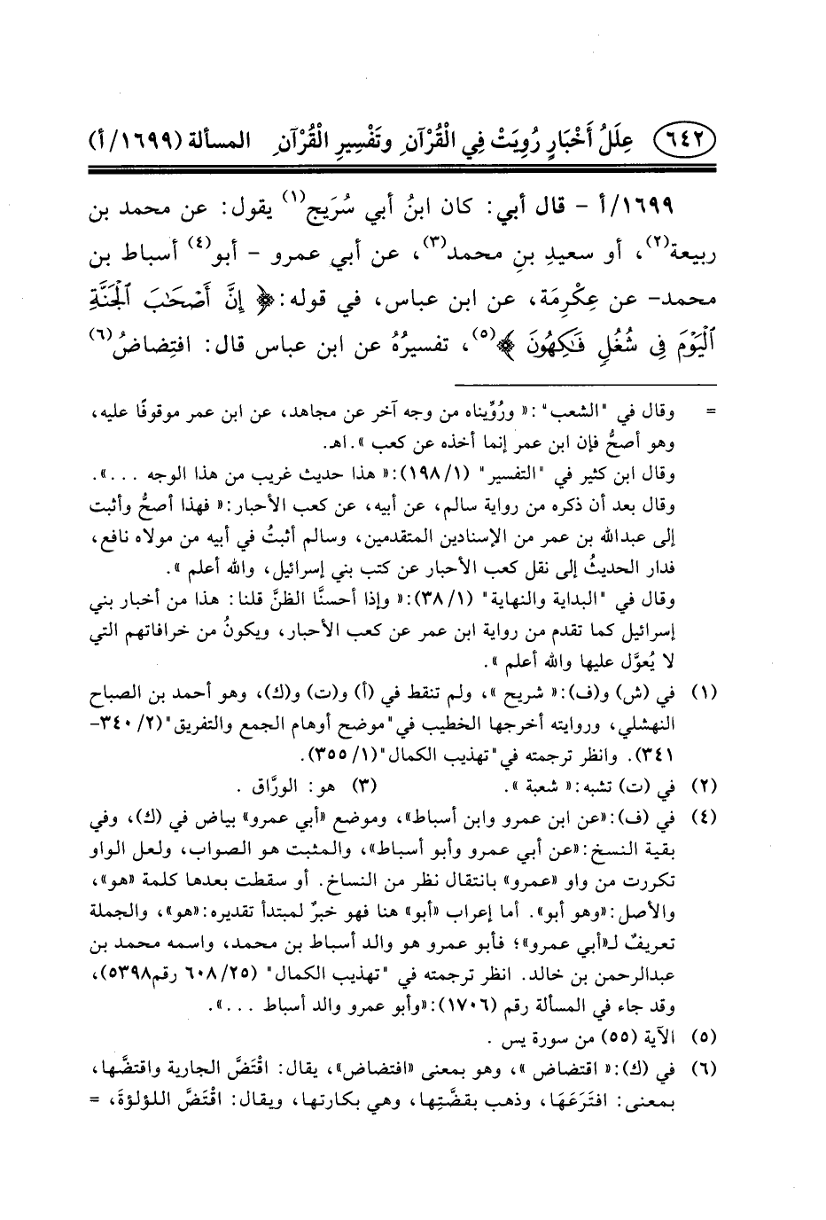 ١٦٩٩/أ - قال أبي: كان ابنُ أبي سُرَيج (١) يَقُولُ: عَنْ مُحَمَّدِ بْنِ رَبِيعَةَ (٢) ، أَوْ سعيدِ بنِ مُحَمَّدٍ (٣) ، عَنْ أبي عمرو - أبو (٤) أَسْبَاطِ بْنِ مُحَمَّدٍ - عَنْ عِكْرِمَة، عَنِ ابْنِ عَبَّاسٍ، فِي قَوْلِهِ: {إِنَّ أَصْحَابَ الْجَنَّةِ الْيَوْمَ فِي شُغُلٍ فَاكِهُونَ *} (٥) ، تفسيرُهُ عَنِ ابْنِ عَبَّاسٍ قَالَ: افتِضاضُ (٦)