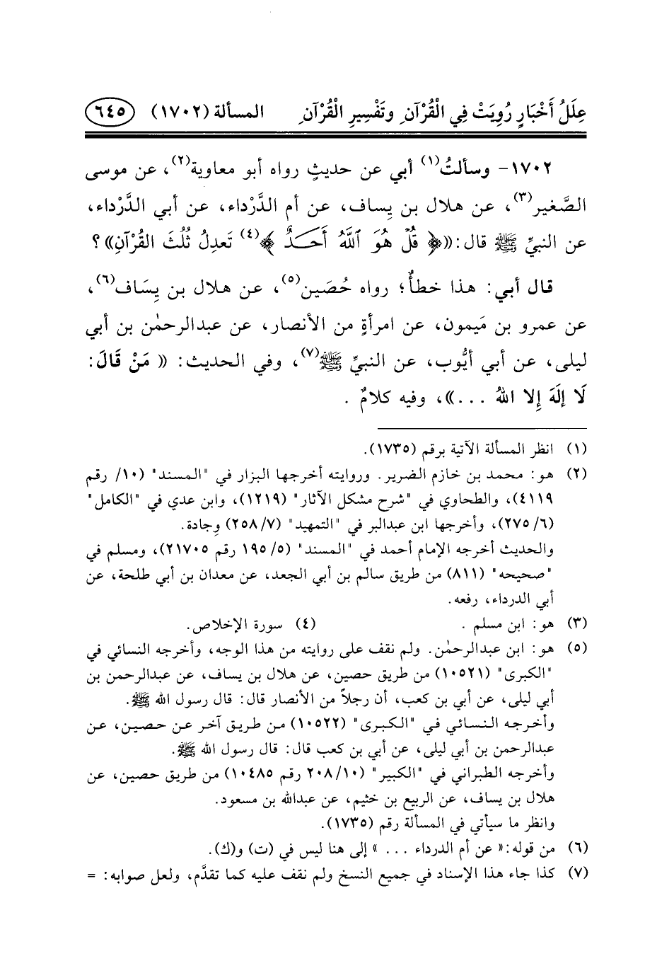 (٧) كذا جاء هذا الإسناد في جميع النسخ ولم نقف عليه كما تقدَّم، ولعل صوابه: «حُصَين، عَن هلال بْن يِسَاف، عَنْ عَمْرِو بْنِ مَيمون، عَنْ عبد الرحمن بْنِ أَبِي لَيْلَى، عَنِ امْرَأَةٍ مِنَ الأَنْصَارِ، عَنْ أَبِي أيُّوب، عن النبيِّ (ص) » . وانظر تخريج المسألة رقم (١٧٣٥) ، والله أعلم.