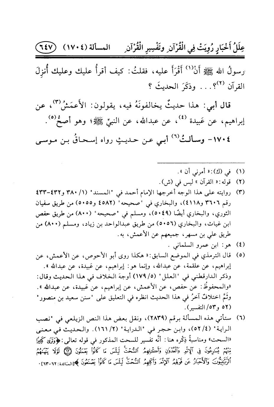 ١٧٠٤- وسألتُ (٦) أَبِي عَنْ حديثٍ رَوَاهُ إسحاقُ بْنُ مُوسَى