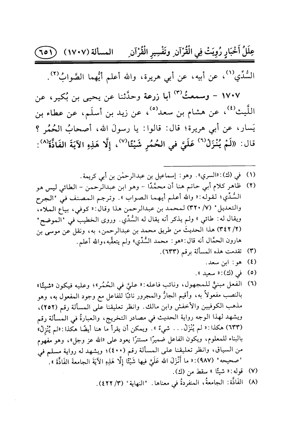 (٦) الفعل مبنيٌّ للمجهول، ونائب فاعله: «عليَّ في الحُمُر» ؛ وعليه فيكون «شيئًا» بالنصب مفعولاً به، وأقيم الجارُّ والمجرور نائبًا للفاعل مع وجود المفعول به، وهو مذهب الكوفيين والأخفش وابن مالك. وانظر تعليقنا على المسألة رقم (٢٥٢) ، ويشهد لهذا الوجه رواية الحديث في مصادر التخريج، والعبارةُ في المسألة رقم (٦٣٣) هكذا: «لم يُنْزَلْ ... شيءٌ» . ويمكن أن يقرأ ما هنا أيضًا هكذا: «لم يُنْزِلْ» بالبناء للمعلوم، ويكون الفاعل ضميرًا مستترًا يعود على «الله عز وجل» ، وهو مفهوم من السياق، وانظر تعليقنا على المسألة رقم (٤٠٠) ؛ ويشهد له رواية مسلم في "صحيحه" (٩٨٧) : «ما أَنْزَلَ الله عَلَيَّ فيها شَيْئًا إِلَاّ هَذِهِ الآيَةَ الجامعةَ الفَاذَّةَ» .