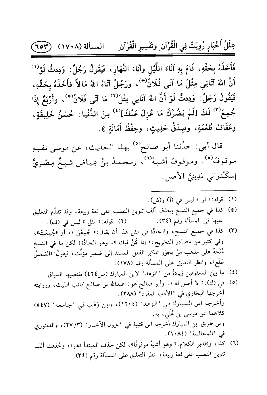أَنَّ اللهَ آتَانِي مِثْلَ مَا آتَى فُلَانً (*) ، ورَجُلٌ آتَاهُ اللهُ مَالاً فأَخَذَهُ بِحَقِّهِ، فَيَقُولُ رَجُلٌ: وَدِدتُّ لَوْ أَنَّ اللهَ آتَانِي مِثْلَ (٢) مَا آتَى فُلَانً (*) ، وأَرْبَعٌ إِذَا جُمِعَ (٣) لَكَ [لَمْ يَضُرَّكَ مَا عُزِلَ عَنْكَ] (٤) مِنَ الدُّنْيا: حُسْنُ خَلِيقَةٍ، وعَفَافُ طُعْمَةٍ، وصِدْقُ حَدِيثٍ، وحِفْظُ أَمَانَةٍ.