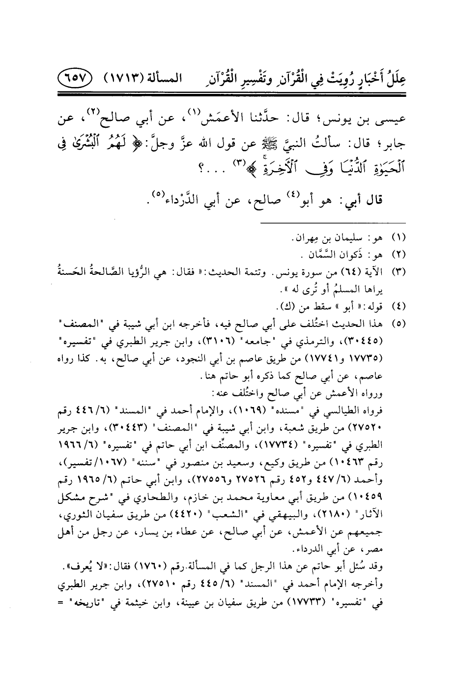 عِيسَى بْنُ يُونُسَ؛ قَالَ: حدَّثنا الأعمَش (١) ، عَنْ أَبِي صَالِحٍ (٢) ، عَنْ جابر؛ قال: سألتُ النبيَّ (ص) عَنْ قَوْلِ اللَّهِ عزَّ وجلَّ: {لَهُمُ الْبُشْرَى فِي الْحَيَاةِ الدُّنْيَا وَفِي الآْخِرَةِ} (٣) ... ؟